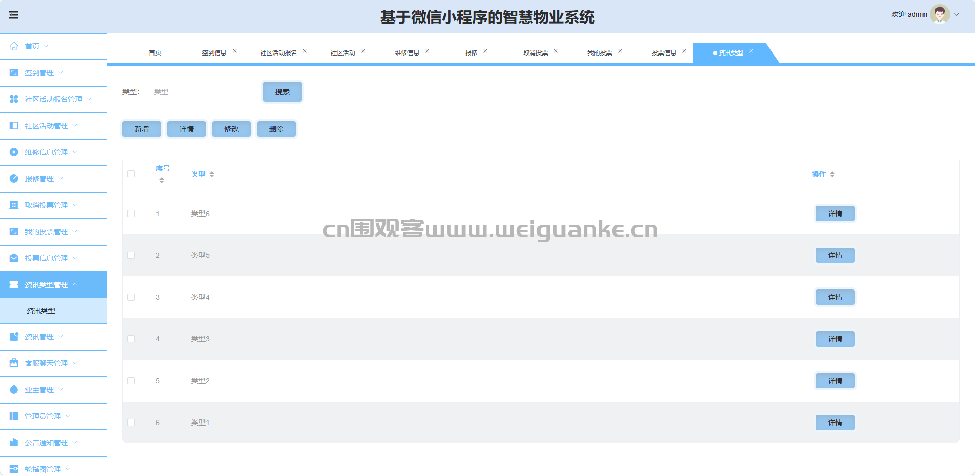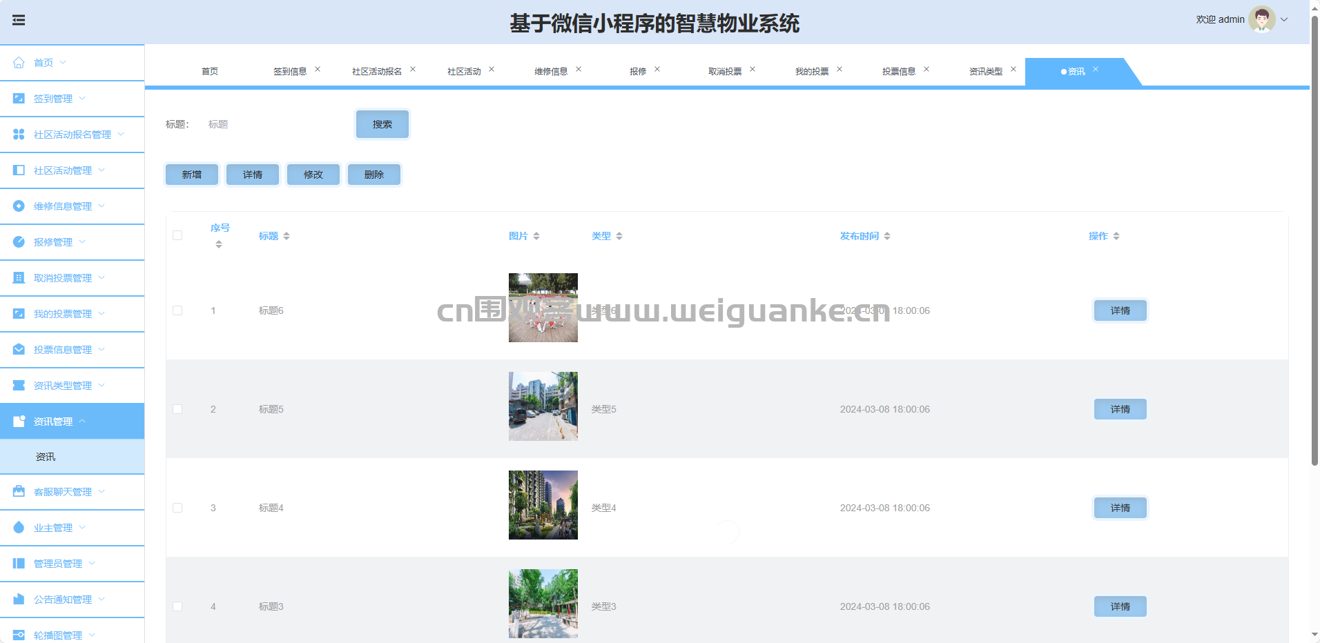 资讯管理:新增、修改、删除、查询资讯内容。