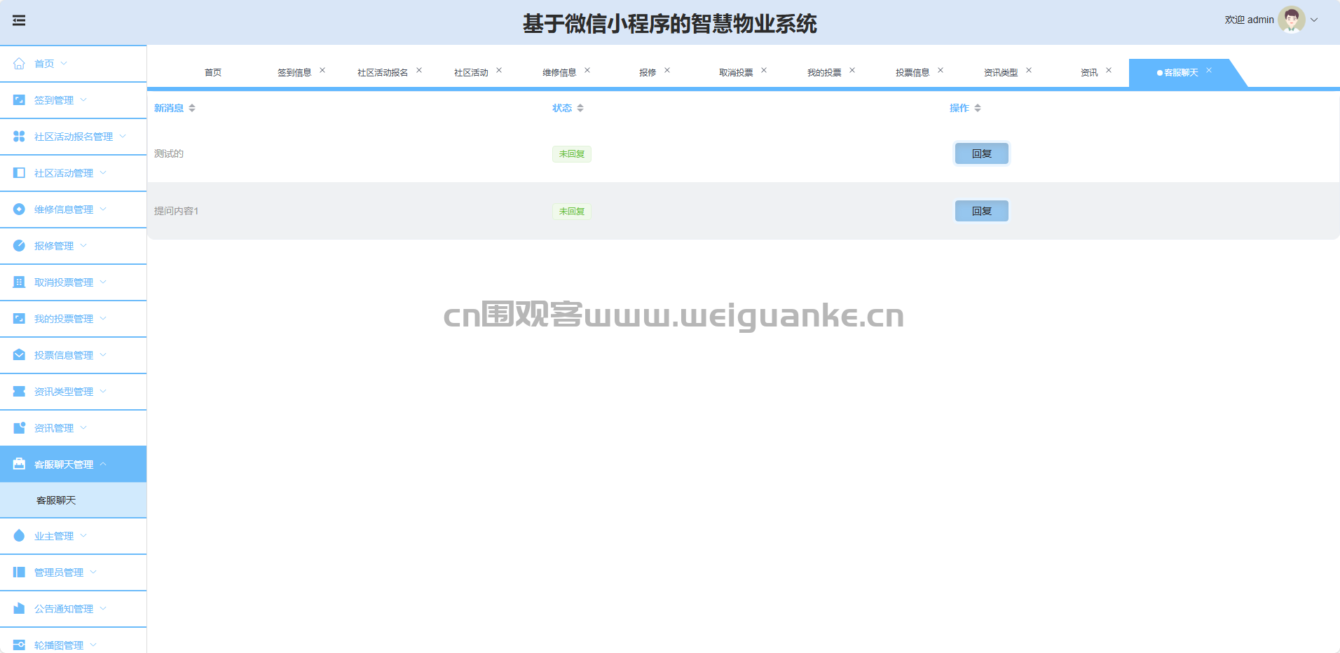 客服聊天管理:查看、标记、删除业主咨询。