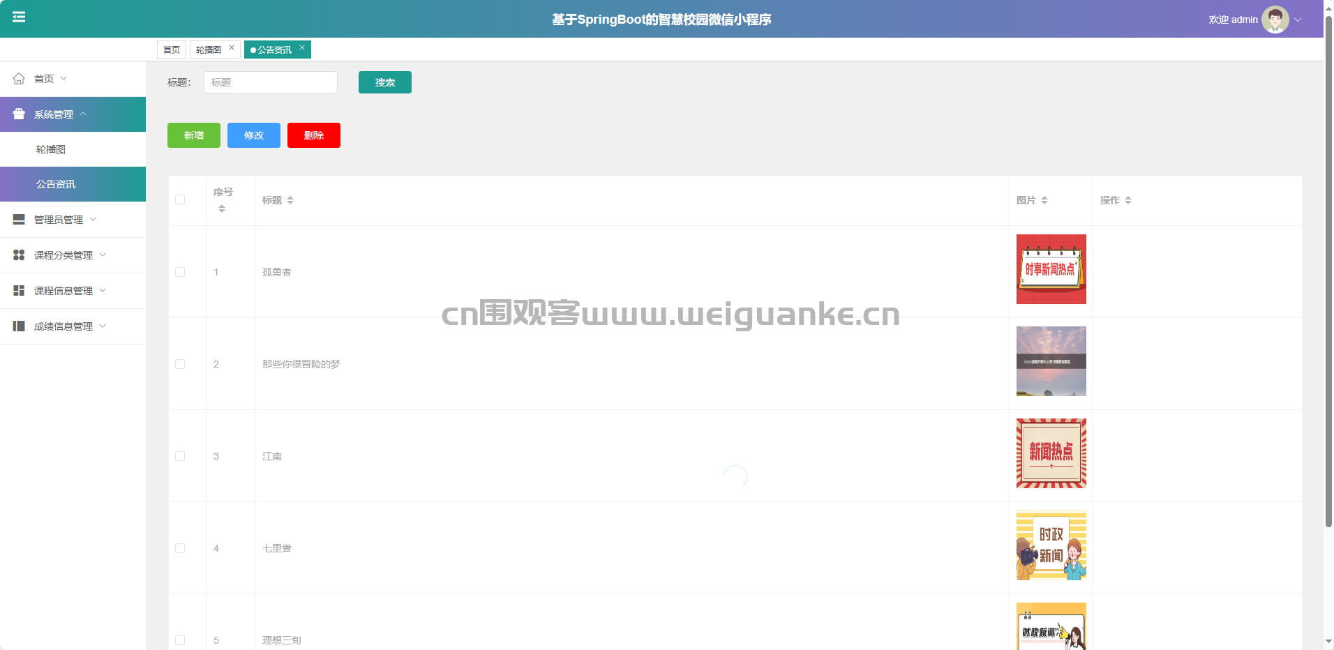 系统管理-公告资讯:新增、修改、删除、查询公告。