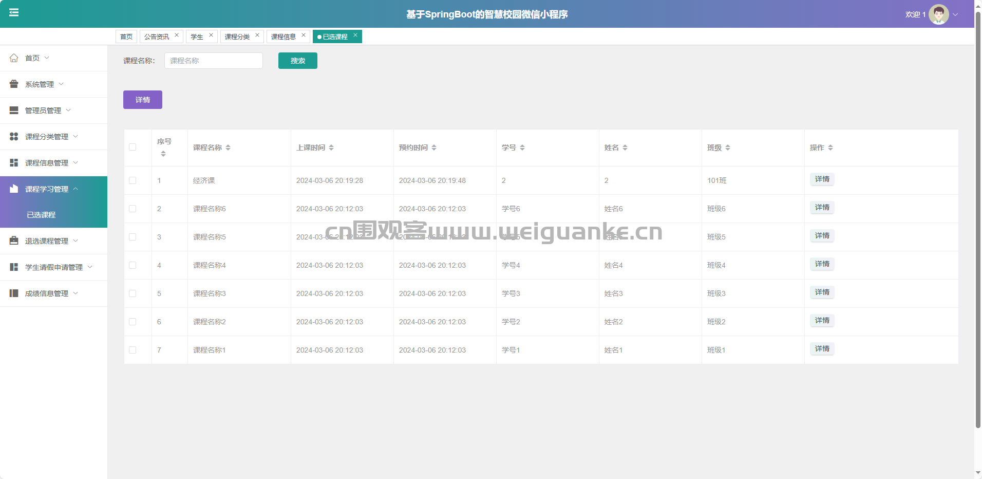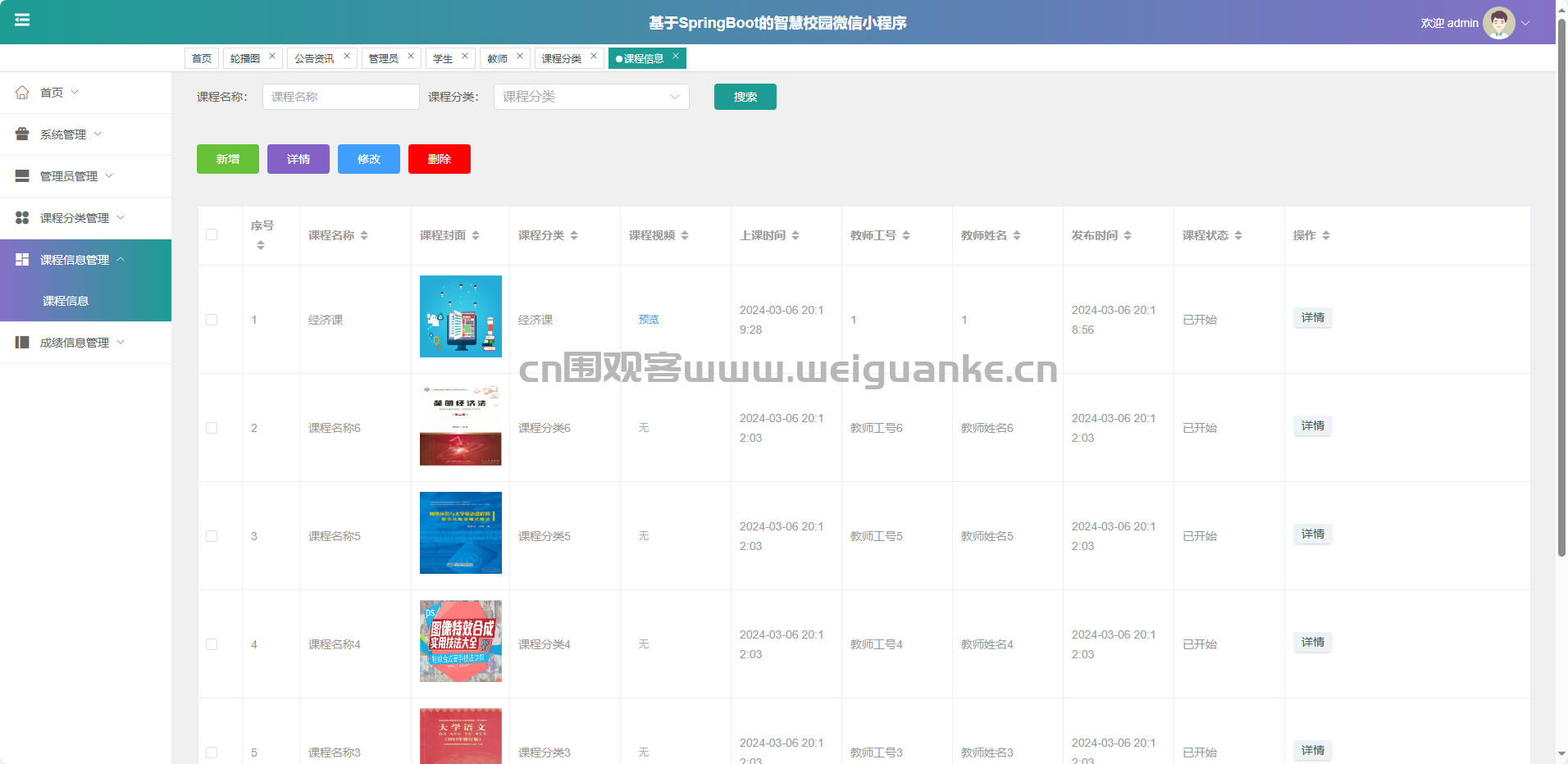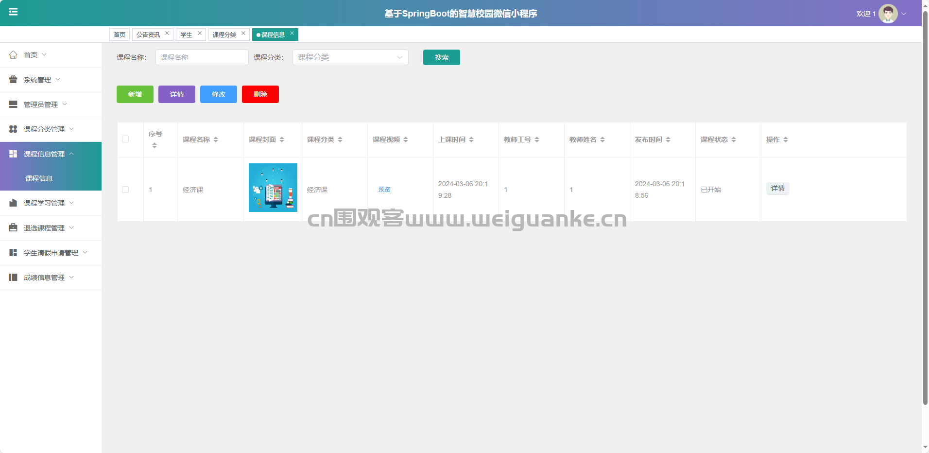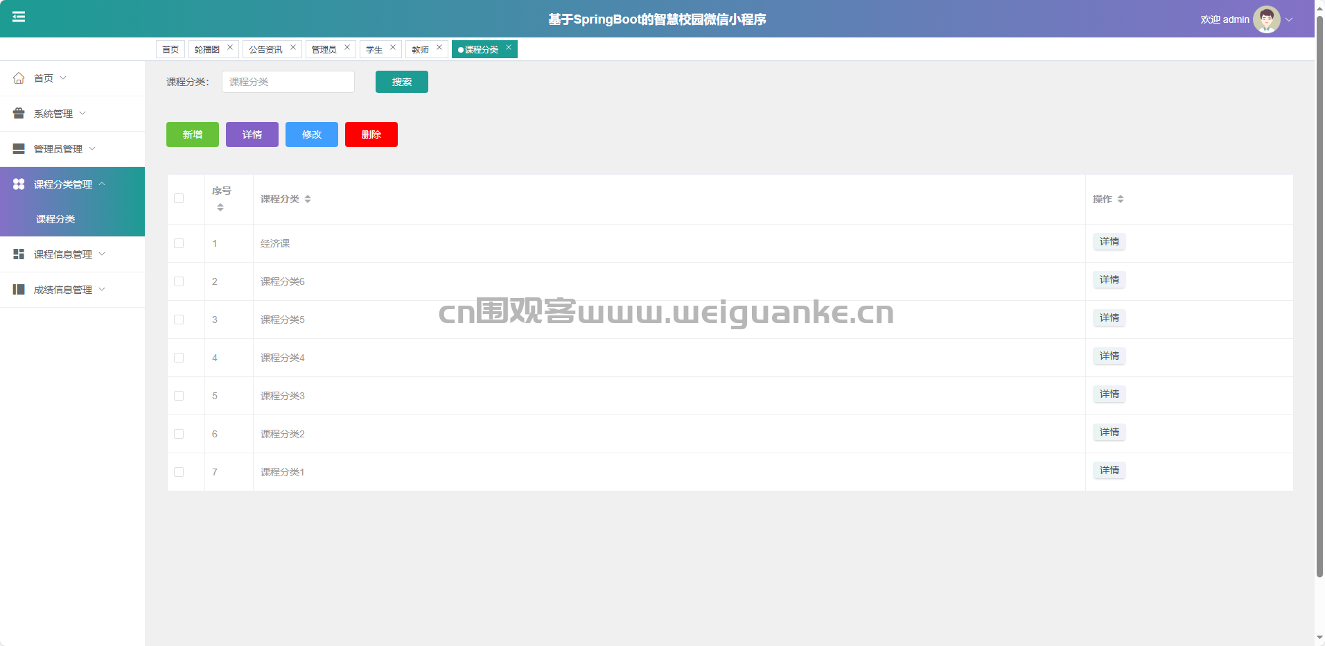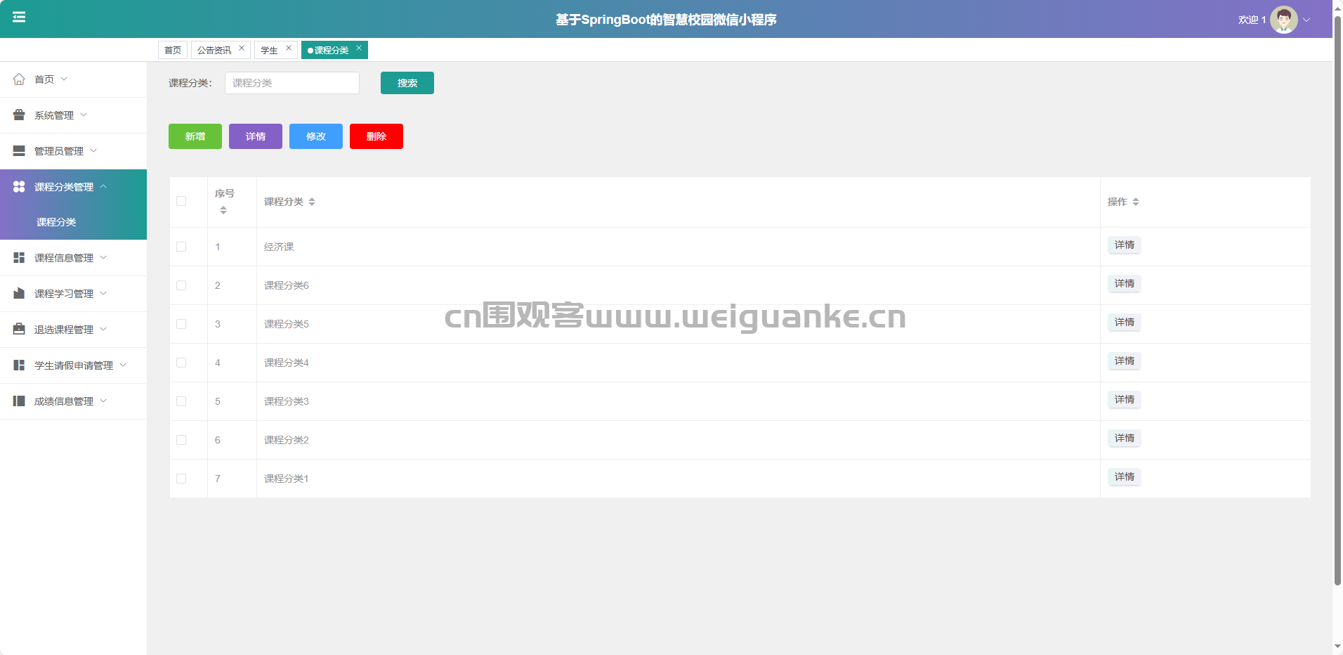 课程信息管理:新增、修改、删除、查询课程详情。