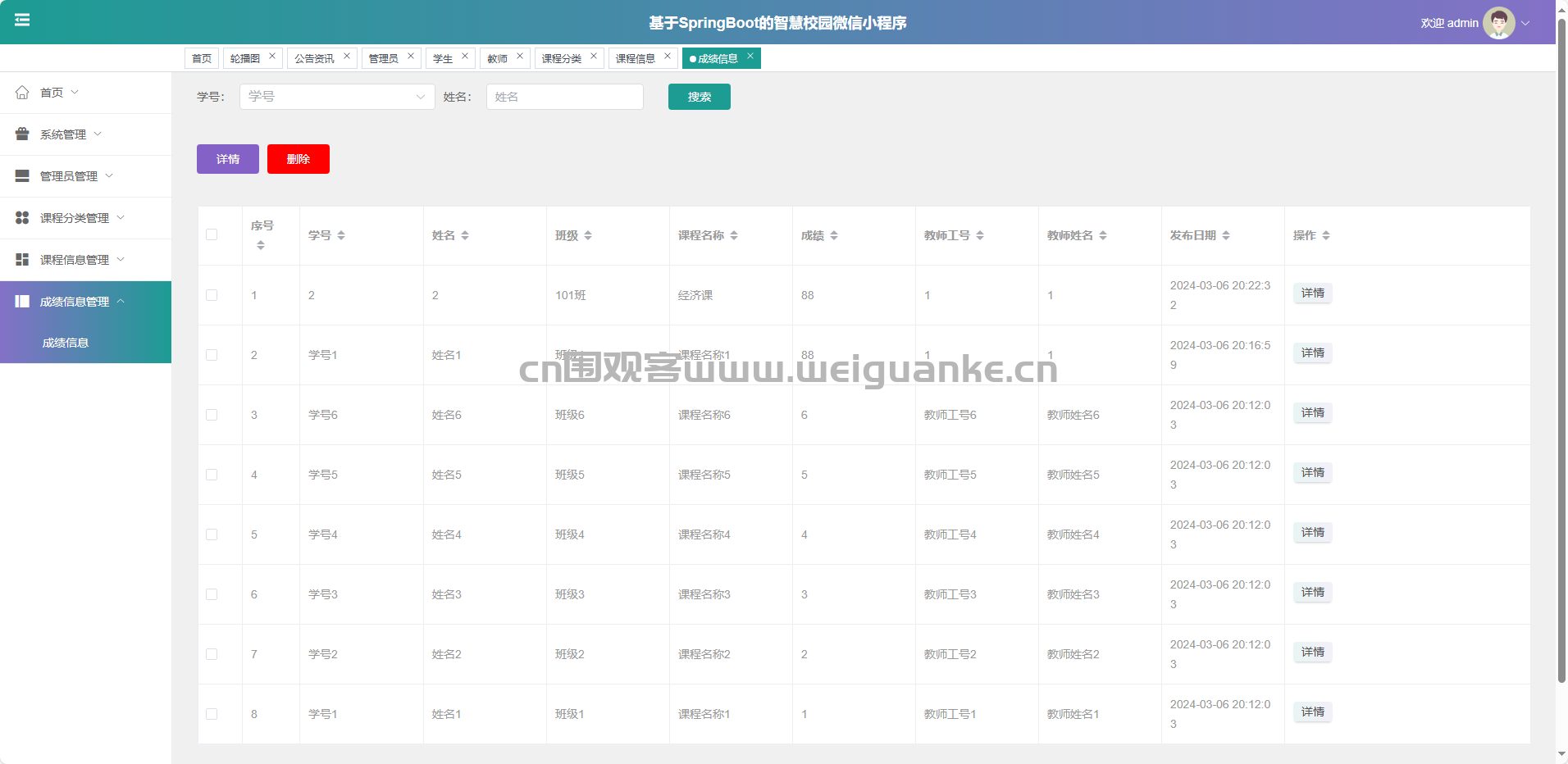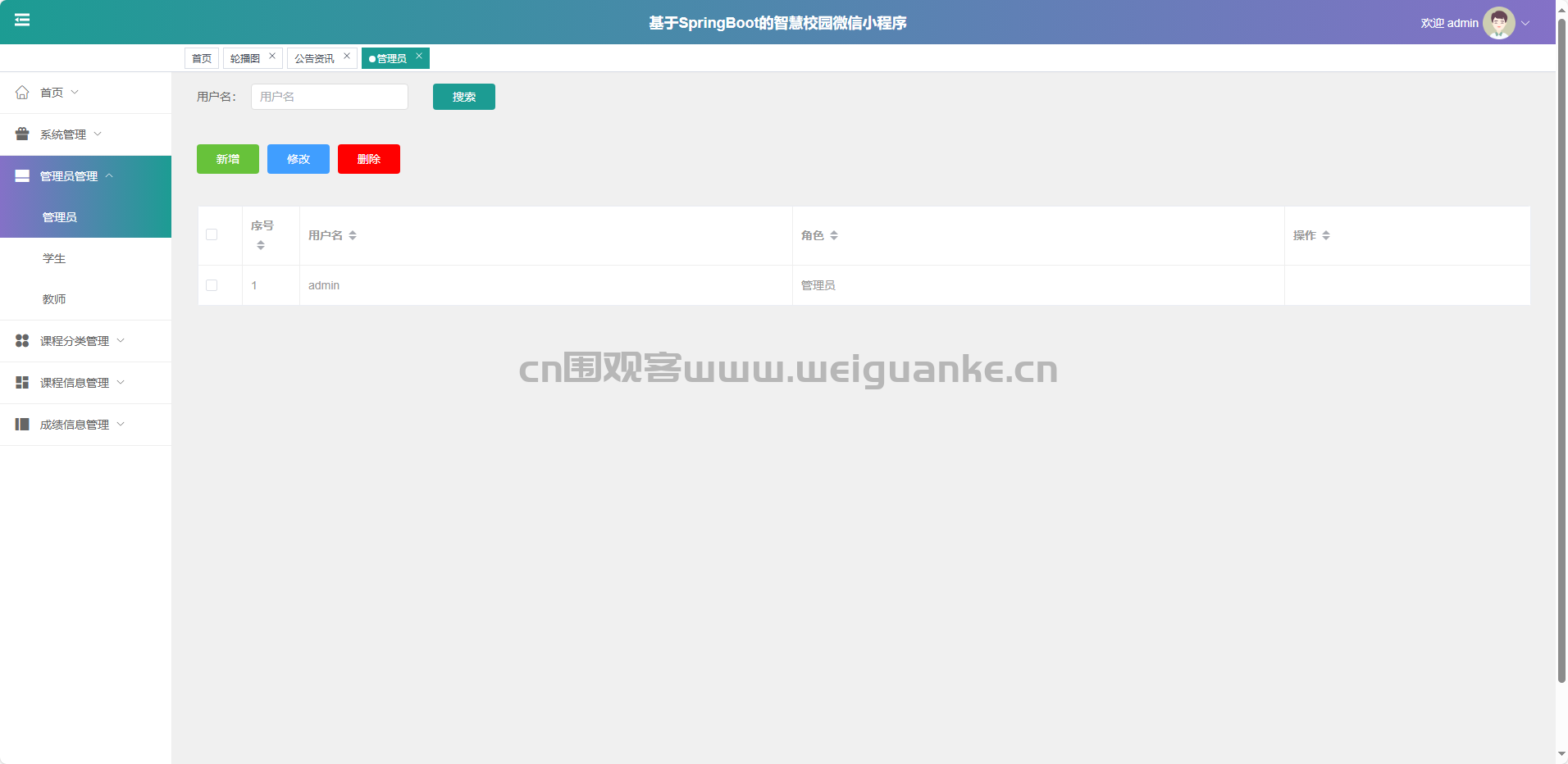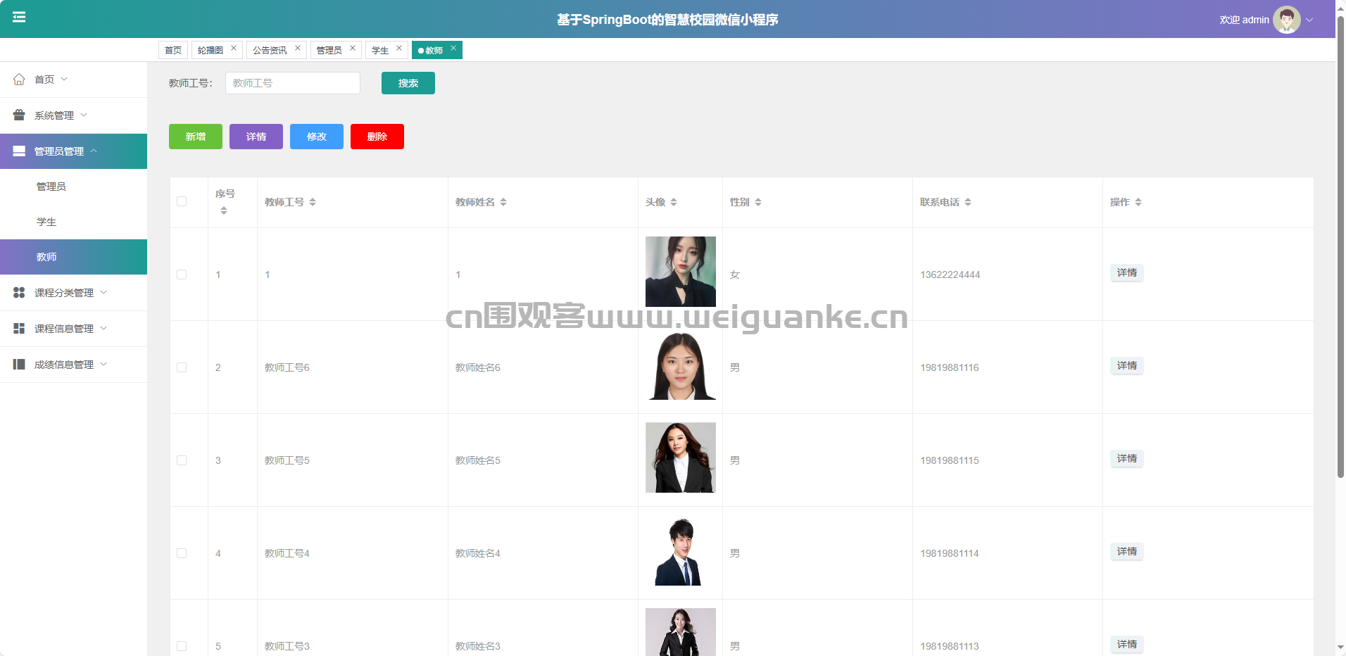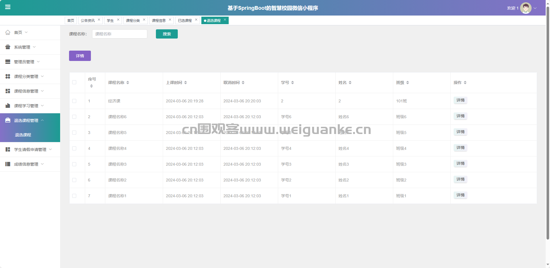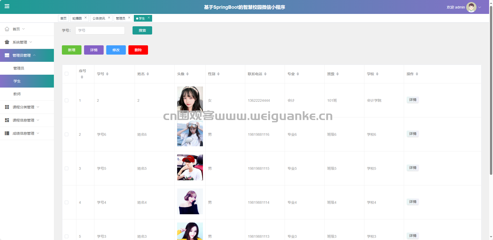 课程信息管理:新增、修改、删除、查询课程详情。