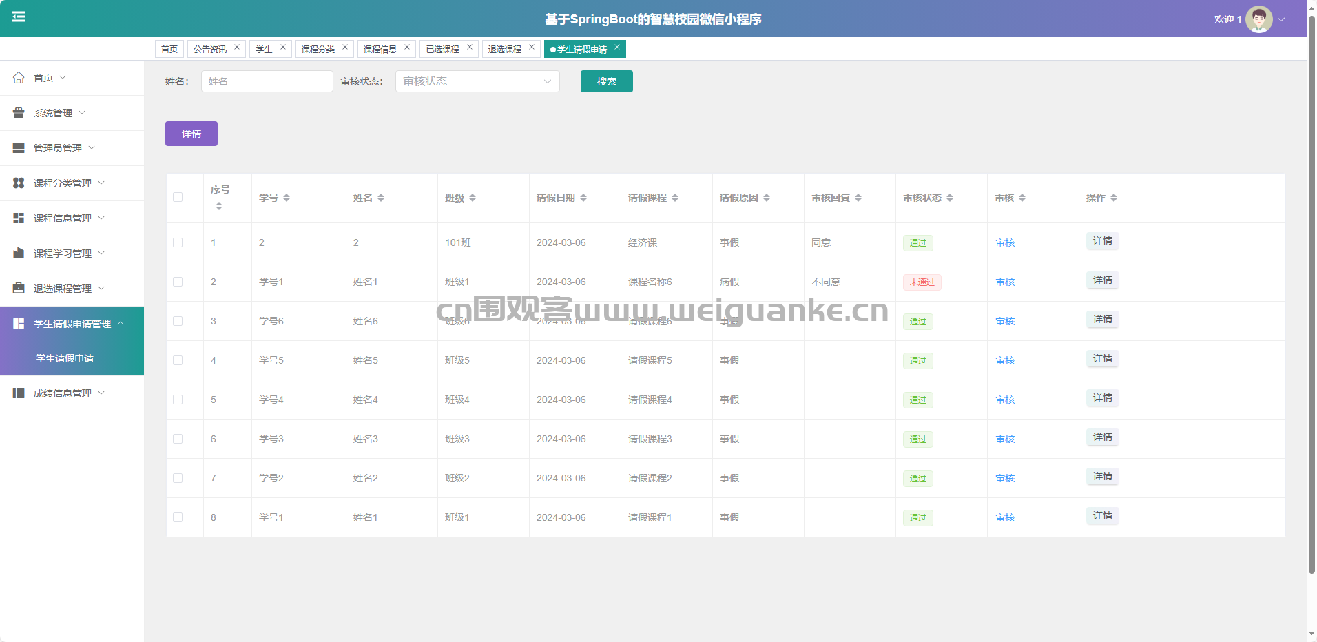 学生请假申请管理:审核、确认或驳回请假申请。