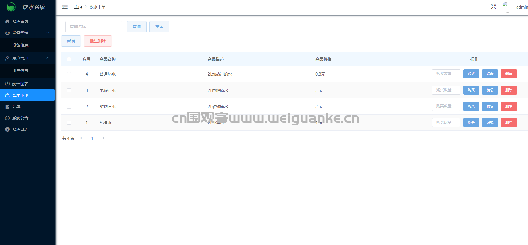 – 管理员可以为用户或自己下单购买饮水服务,管理饮水的配送和库存。