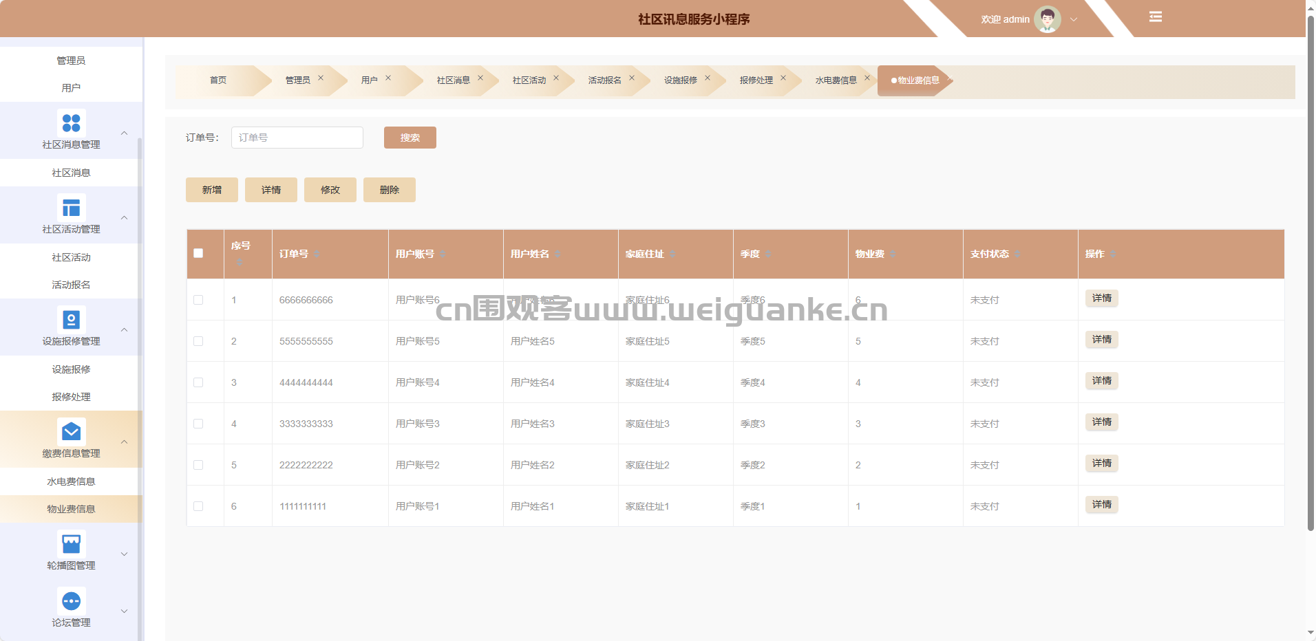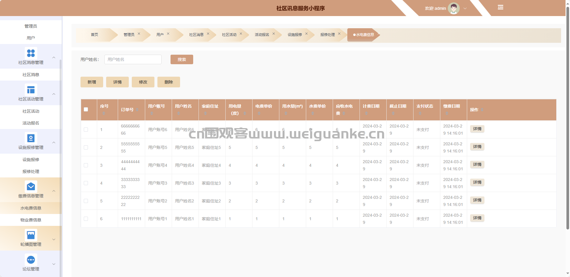 缴费信息管理:统一展示并核对水电及物业费用明细。