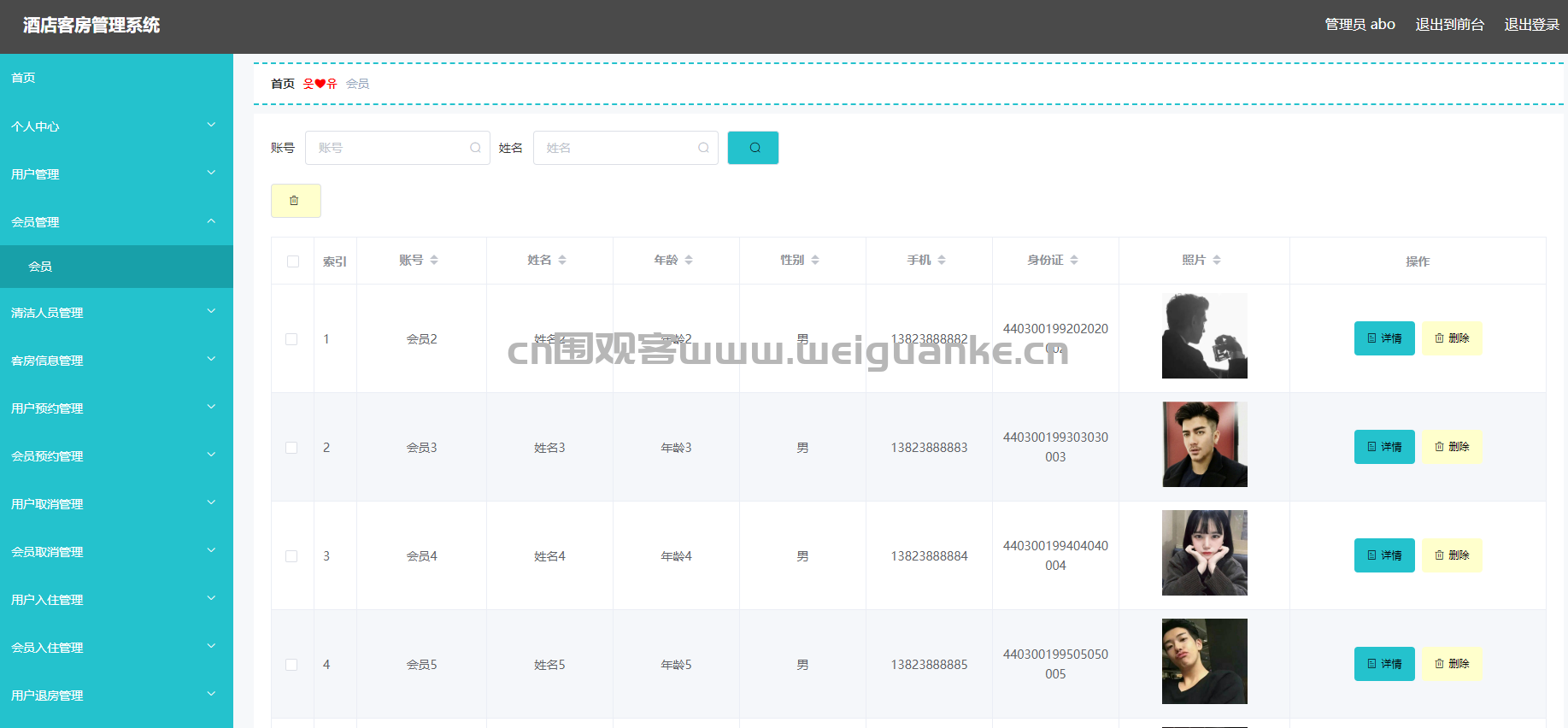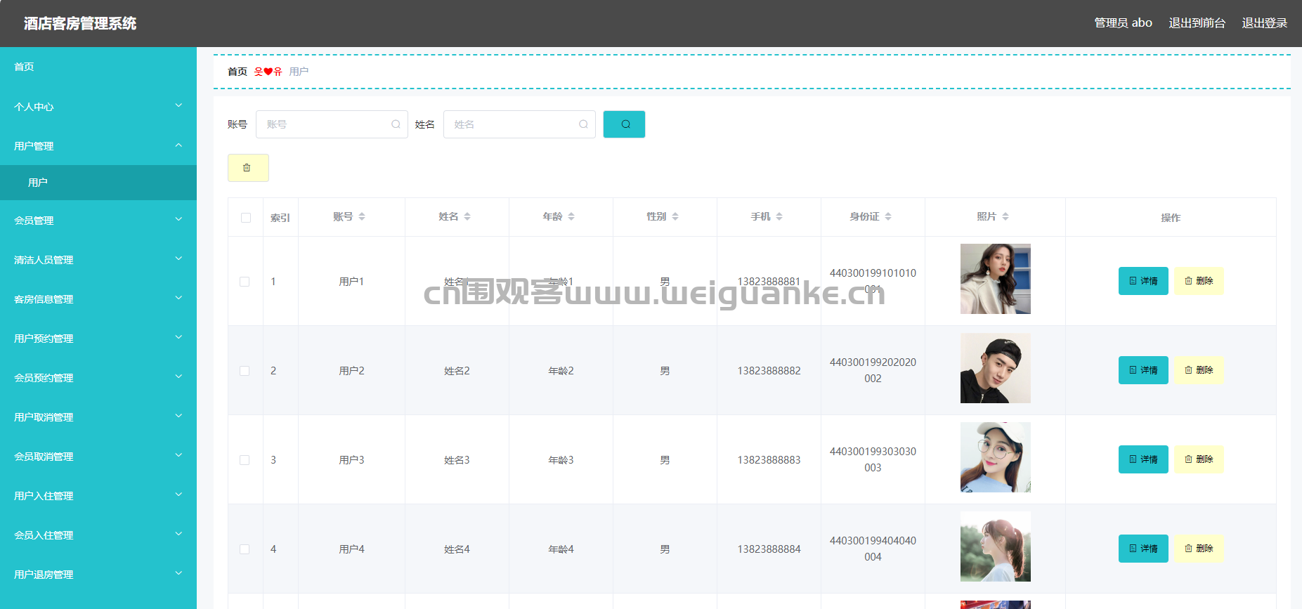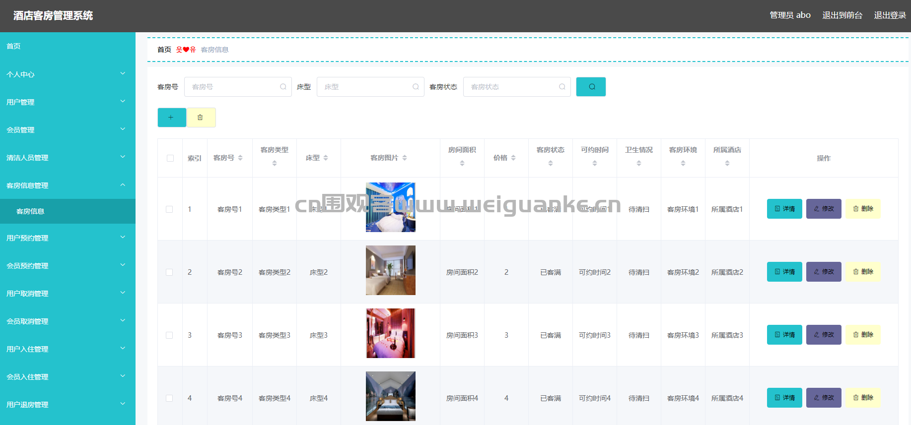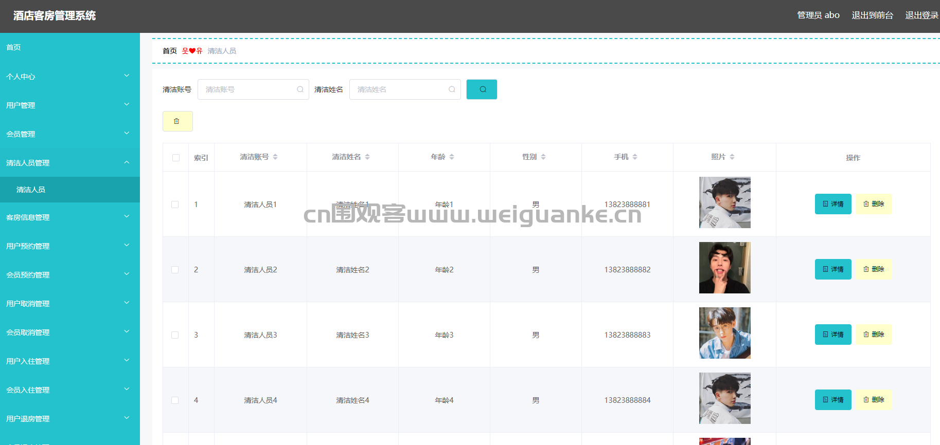 – 首页:提供系统整体概览,展示关键数据和信息,如用户数量、会员数量、客房预订情况、清洁任务进度等,方便管理员快速了解系统运行状态。