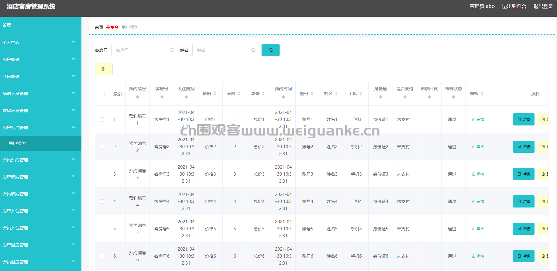 – 用户预约管理:查看和处理普通用户的客房预约请求,包括审核预约申请、确认预约信息、安排房间等,确保用户预约流程的顺畅和高效。