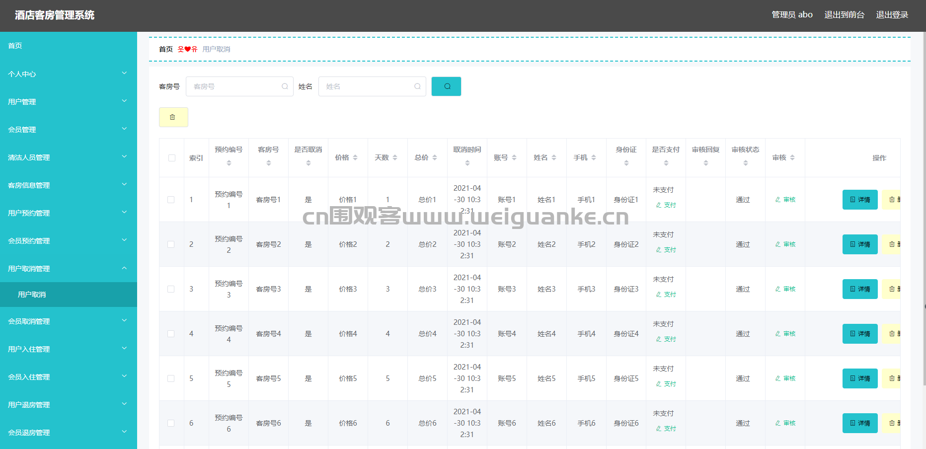 – 用户取消管理:用户可以取消自己已预约的客房,系统会根据取消政策进行相应的操作,如扣除手续费、释放房间等,并记录取消信息,用户可以查看取消流程和结果。