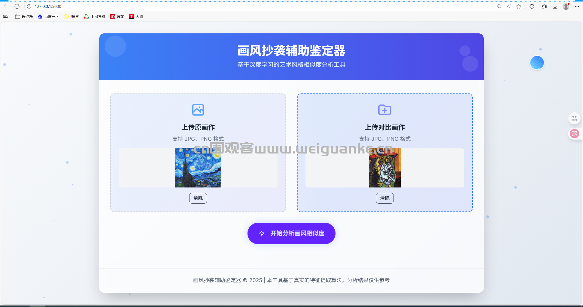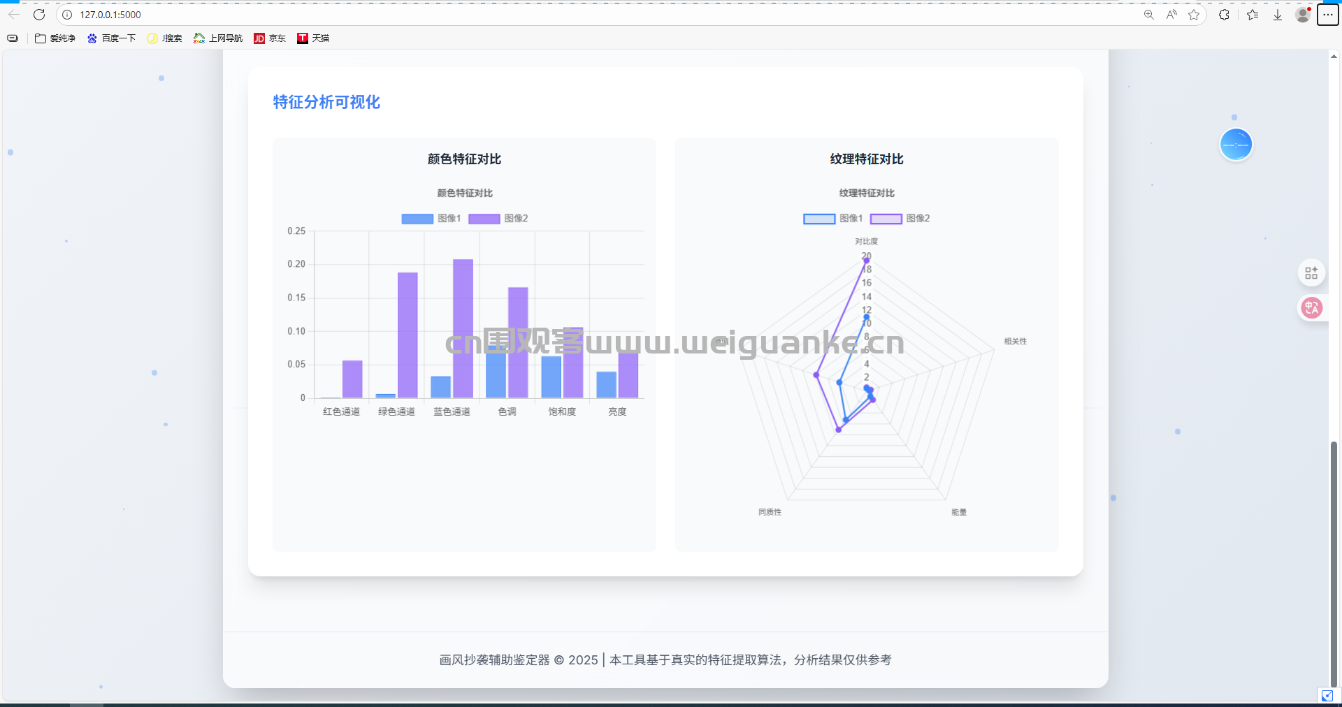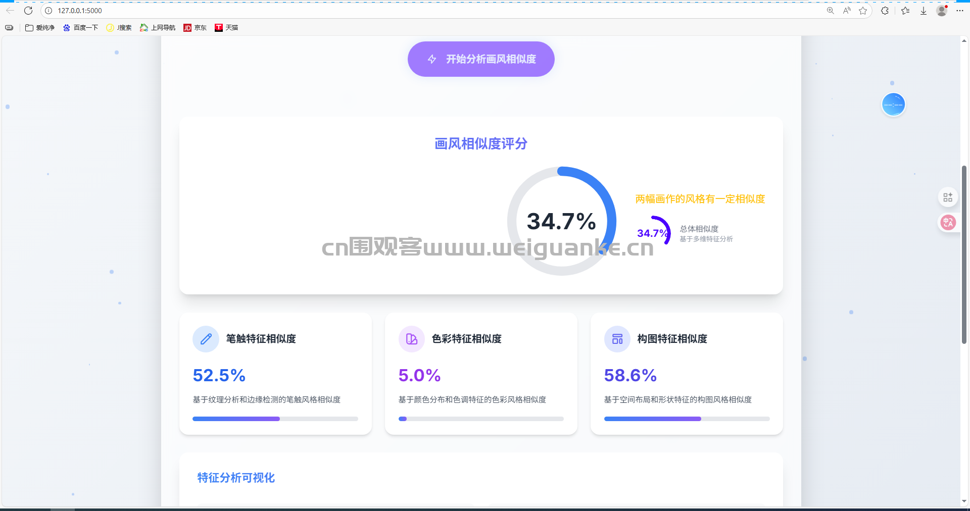 zhe, zhuo python 9小时前 基于画风特征解构的画风抄袭辅助鉴定器 项目描述 基于画风特征解构的画风抄袭辅助鉴定器 项目功能:上传图片进行画风相似度评分以及可视化 运行环境 开发工具:PyCharm 运行环境:python3.8 此配置为本人调试所用,仅供参考 项目技术: 后端:flask 相似度计算算法 纹理特征提取 构图特征提取 以上系统源码经过技术整理与调试,确保能正常运行
