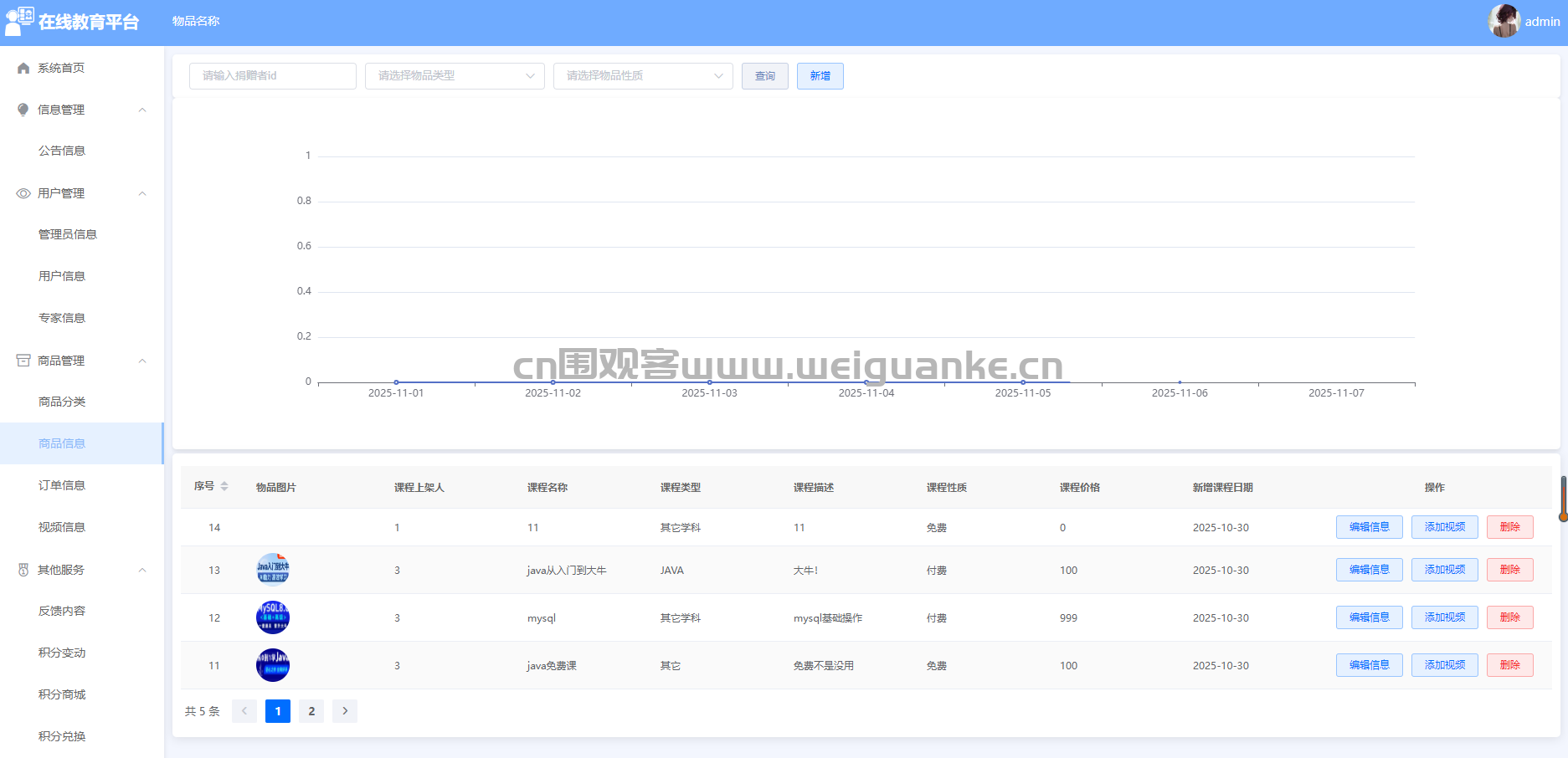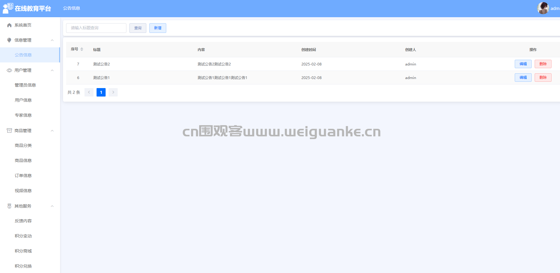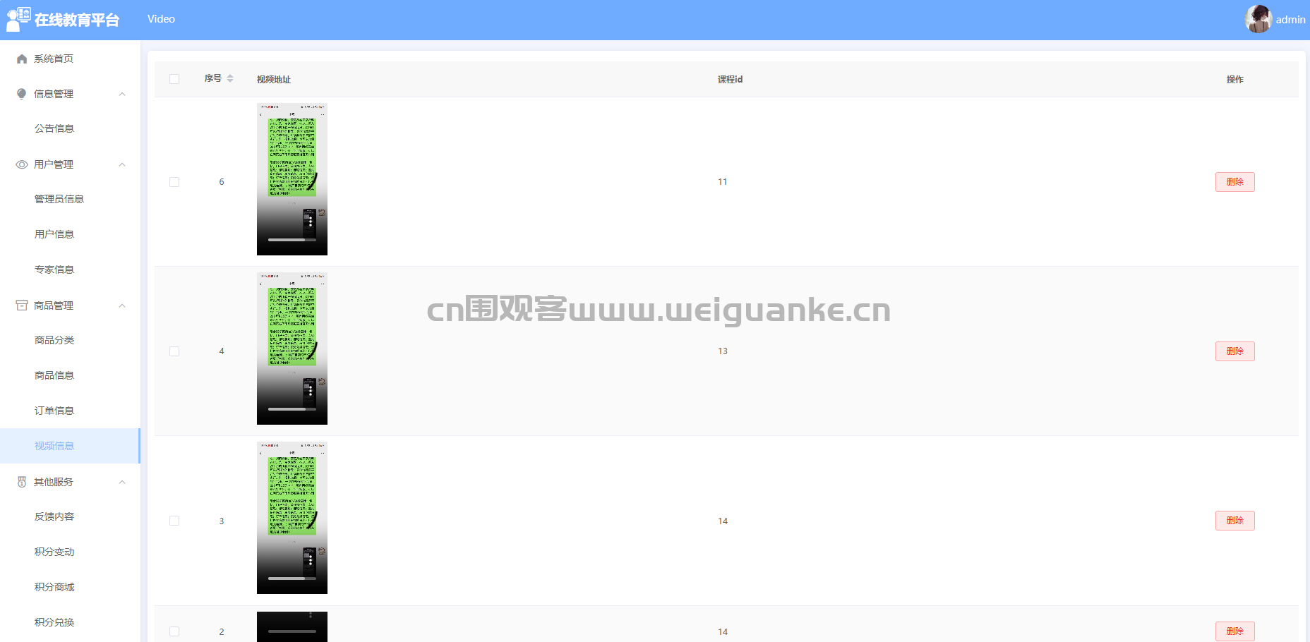 – 功能描述:管理员可以上传、编辑和管理视频内容,包括视频标题、描述、分类等,用于展示商品使用教程、促销活动等内容。
