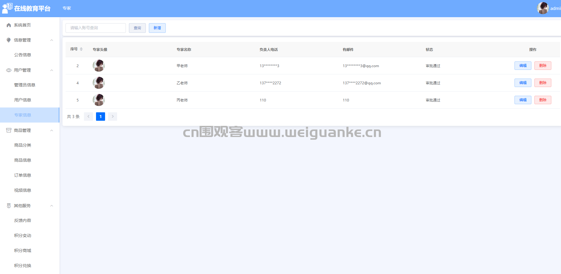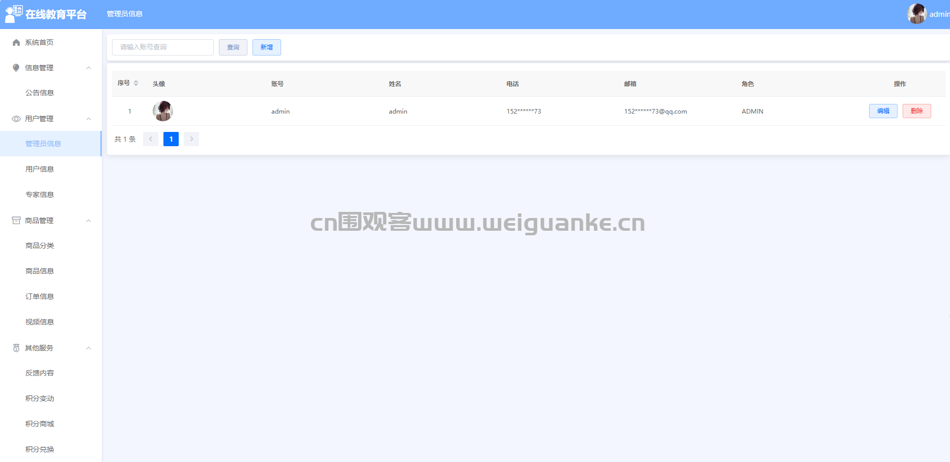 – 功能描述:管理员可以查看和管理所有管理员的账户信息,包括姓名、联系方式、权限设置等,确保系统管理的规范性和安全性。