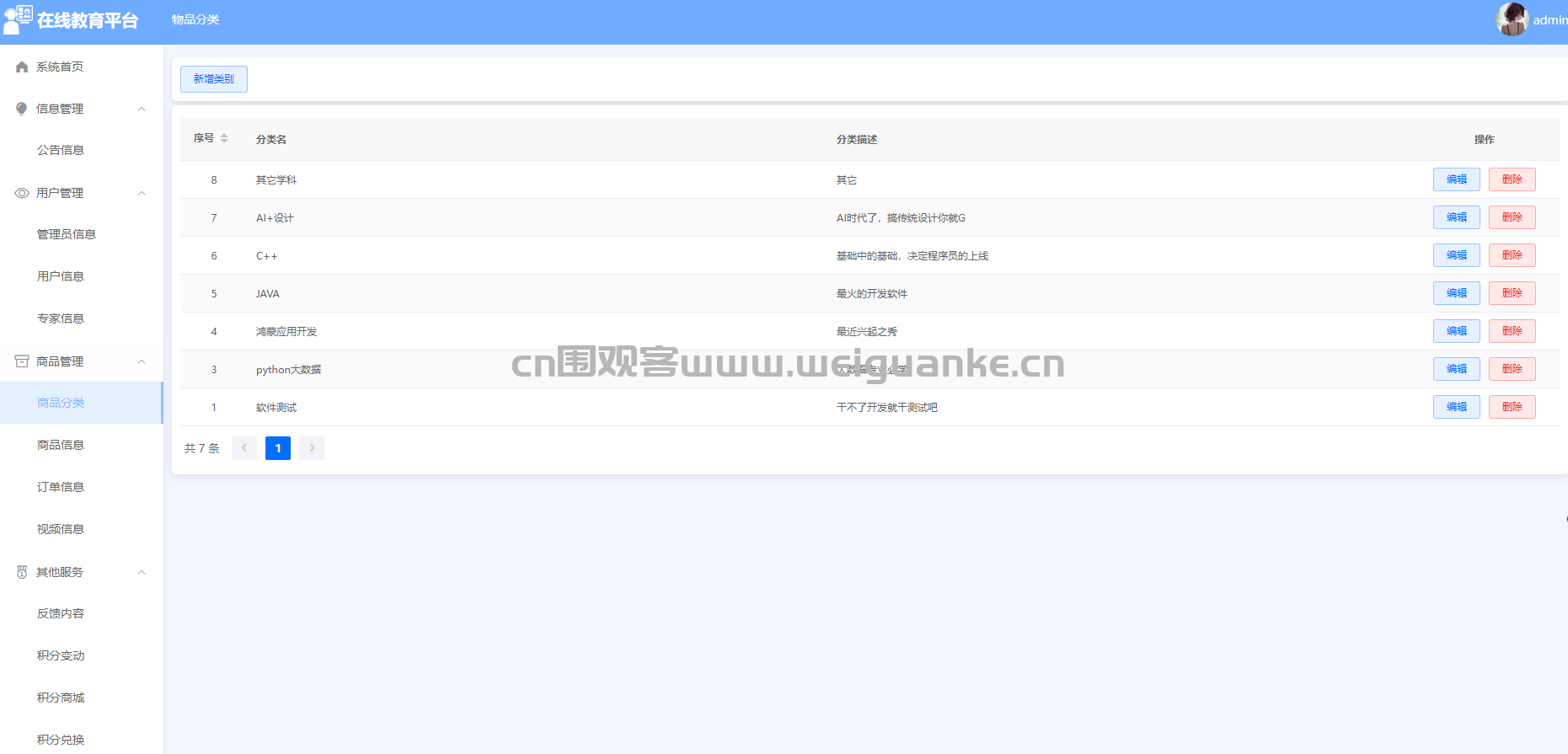 – 功能描述:管理员可以创建、编辑和管理商品分类,确保商品的分类清晰、合理,方便用户查找和购买。
