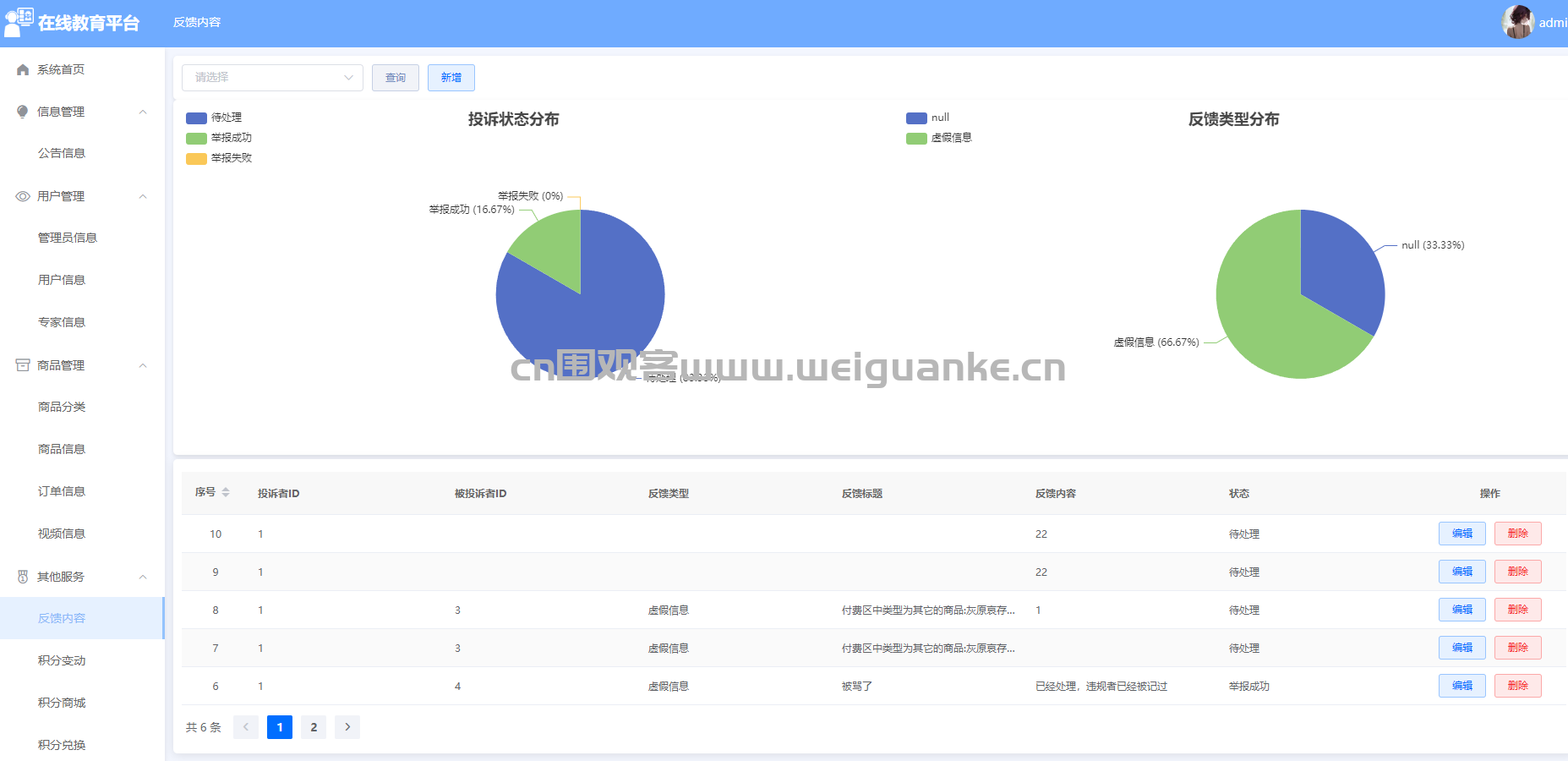 – 功能描述:管理员可以查看和处理用户提交的反馈内容,包括意见、建议和问题,及时回复用户,提升用户体验。