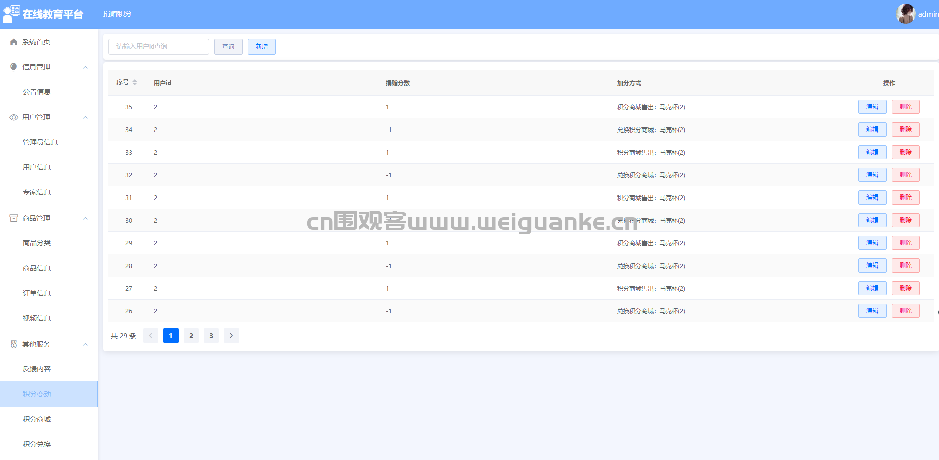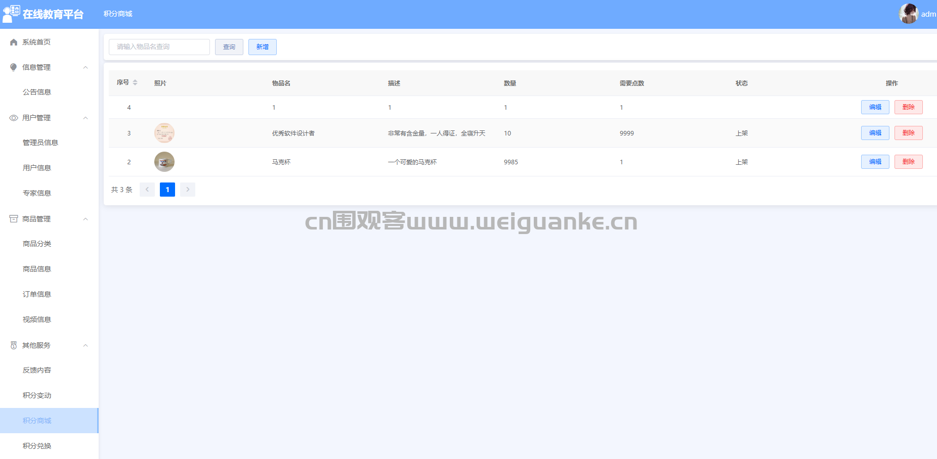 – 功能描述:管理员可以管理积分商城的商品,包括商品的添加、编辑、删除等操作,确保积分商城的正常运行。