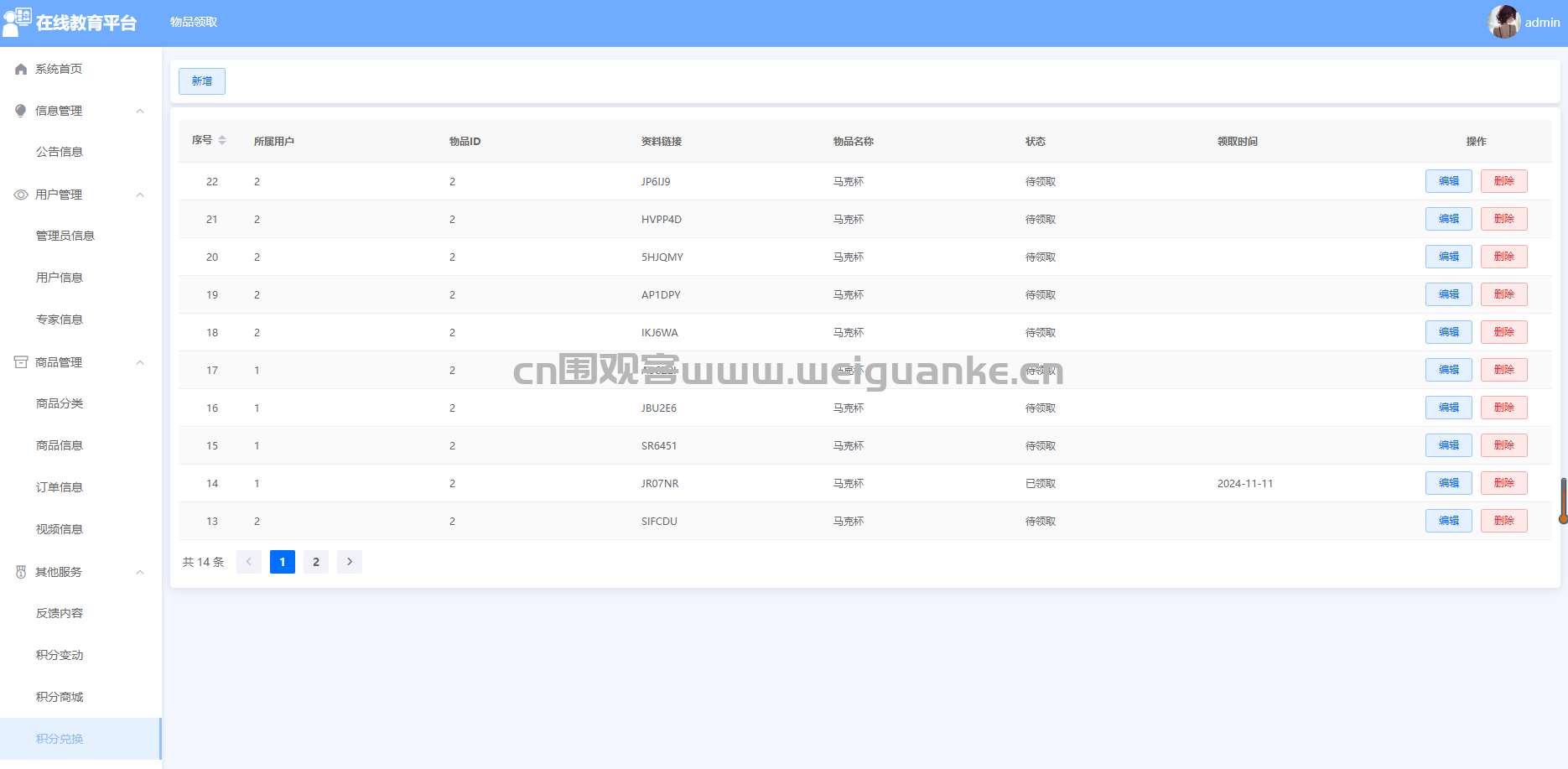 – 功能描述:管理员可以查看和管理用户的积分兑换记录,包括兑换的商品或服务、兑换时间等,方便对积分兑换情况进行统计和分析。