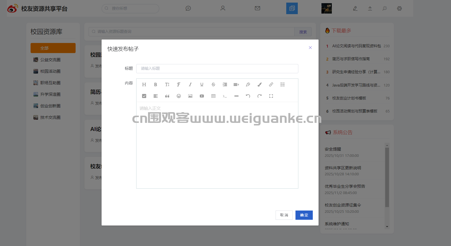 – 功能描述:用户可以上传自己的资源到平台,与其他用户共享,如上传学习笔记、项目文件等。