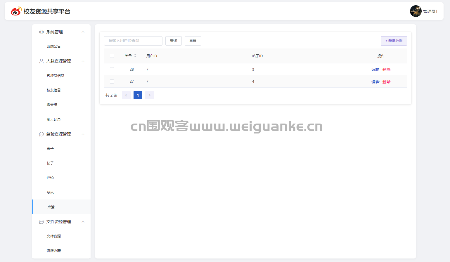 – 功能描述:管理员可以查看和管理用户点赞记录,分析用户喜好和互动情况。