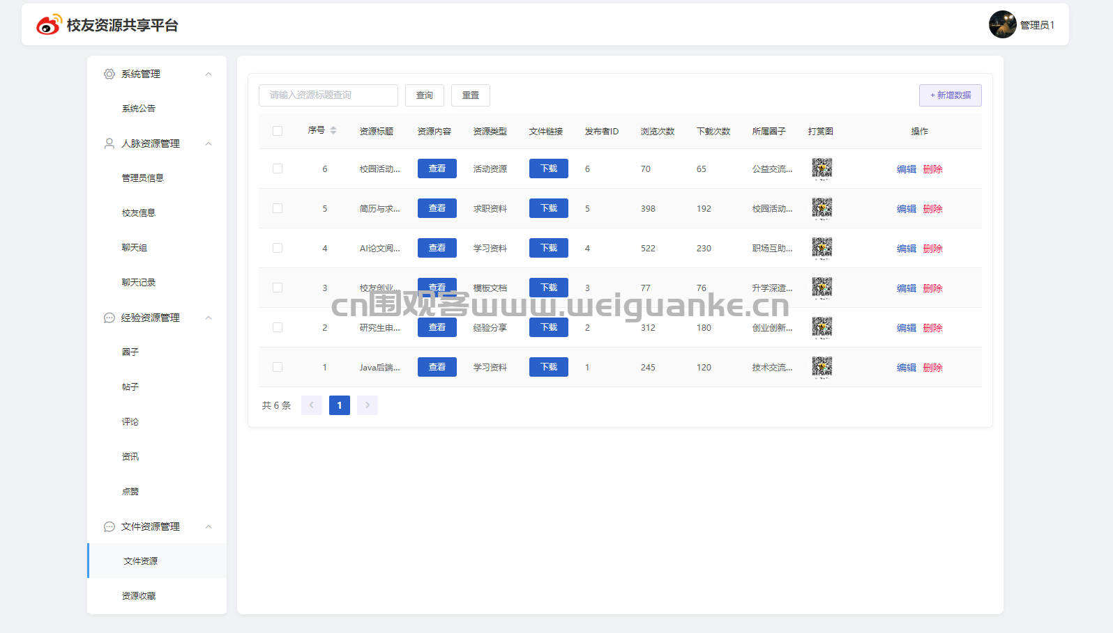 – 功能描述:管理员可以管理平台上的文件资源,包括上传新文件、编辑文件信息、删除过期文件等。