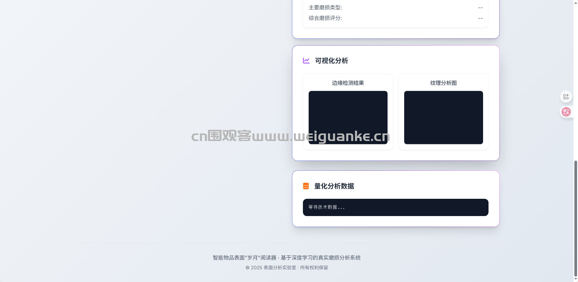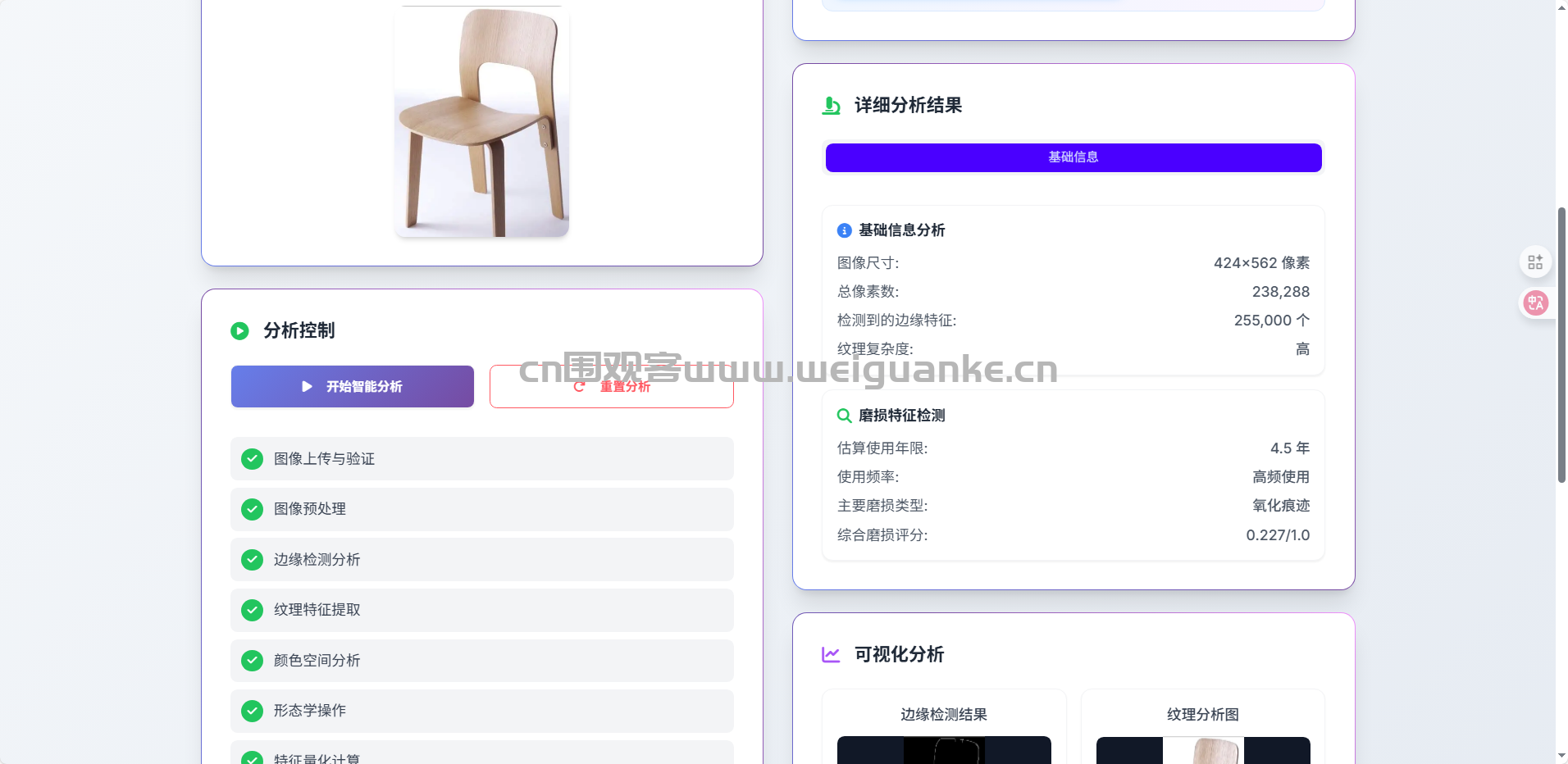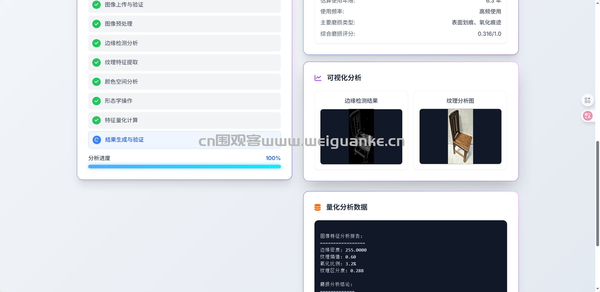 项目功能:智能物品表面”岁月”阅读器是一款基于深度计算机视觉技术的专业分析系统,专门用于通过物品表面的微观痕迹解读其使用历史和使用特征。系统通过先进的图像处理算法,能够精准识别和量化物品表面的磨损模式、氧化痕迹、划痕特征等使用痕迹,从而估算物品的使用年限、使用频率和使用强度。