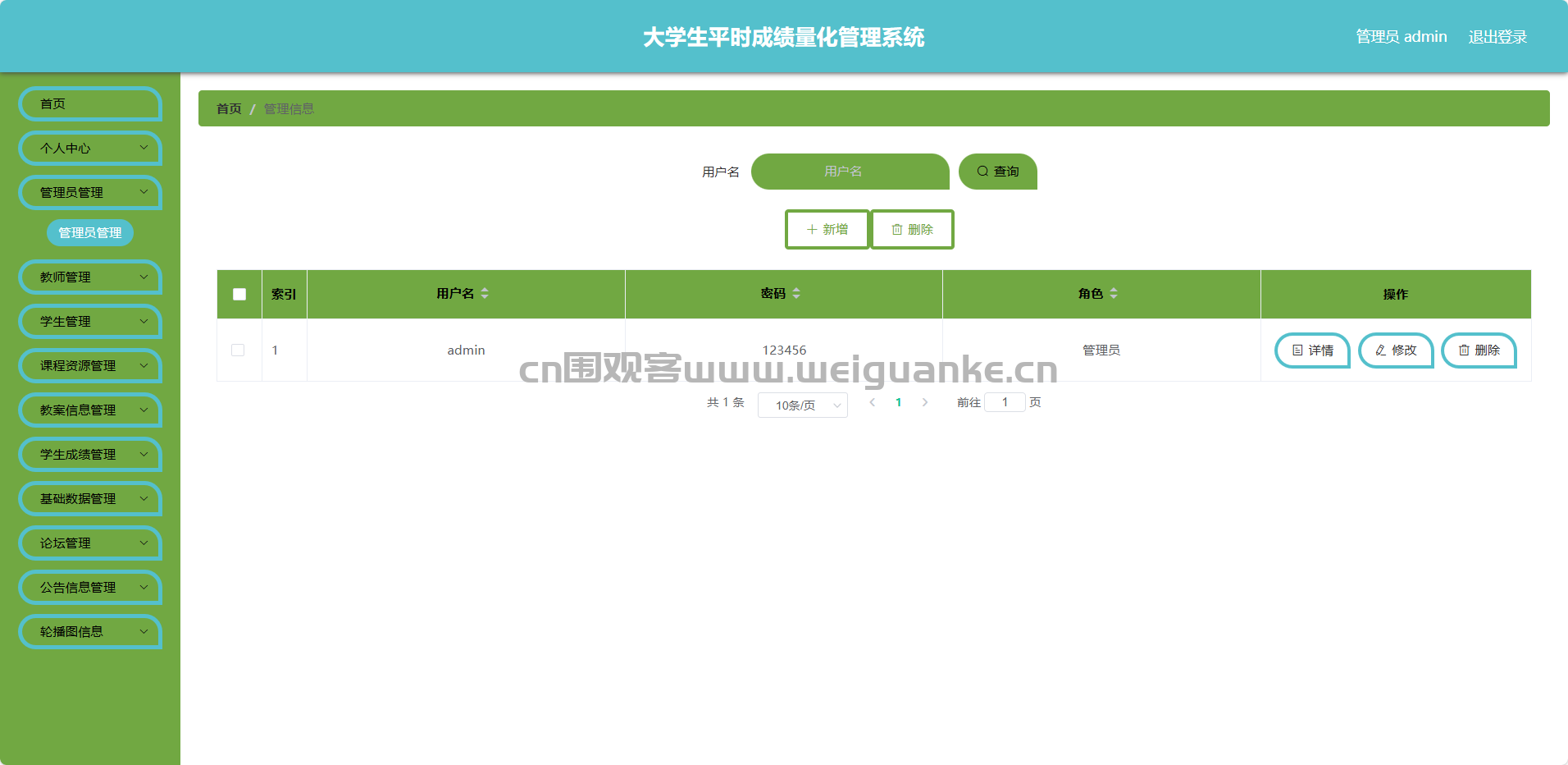 管理员管理:对系统管理员账号进行增删改查及权限分配的管理功能。