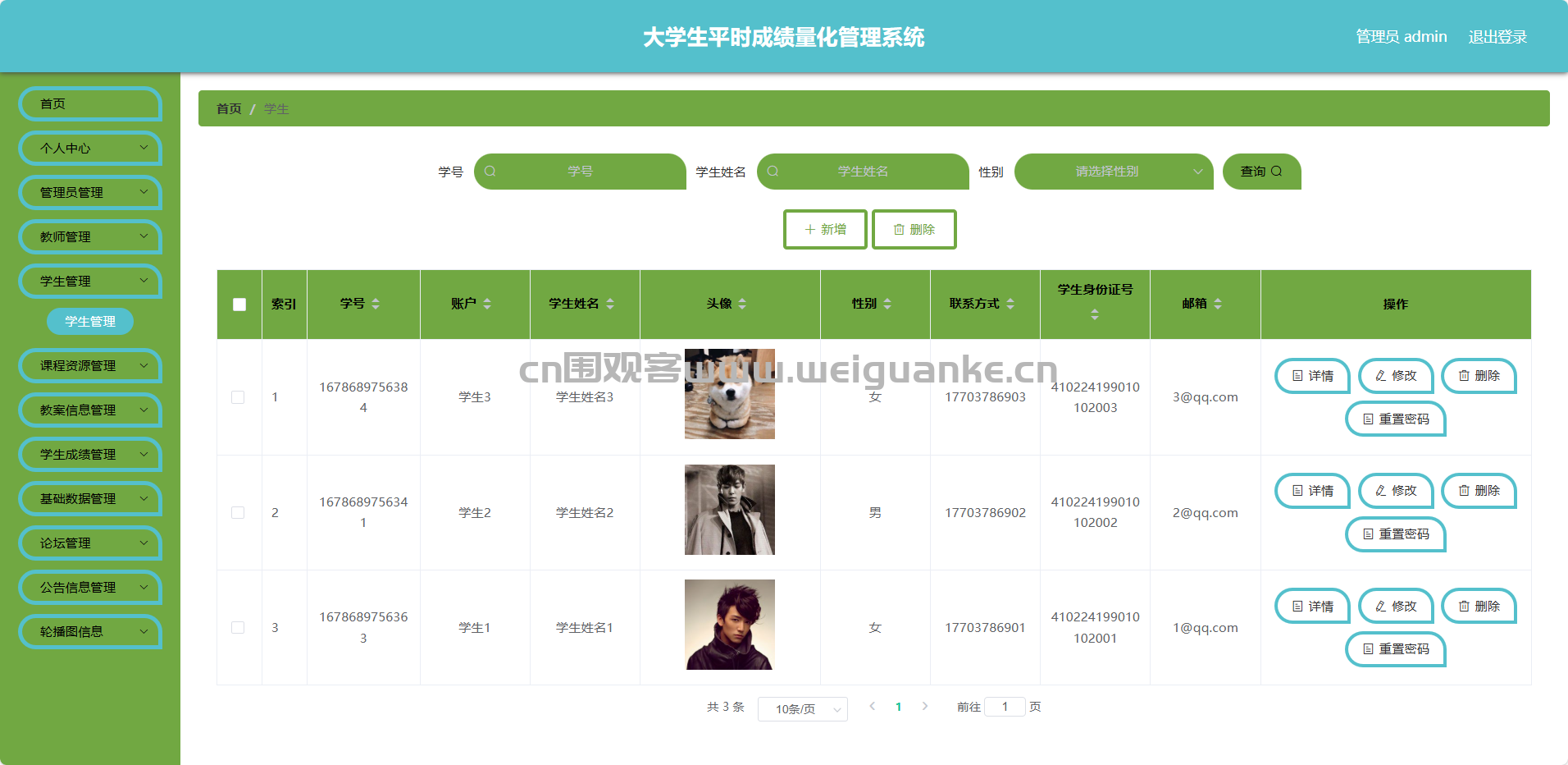 学生管理:统一管理学生档案、班级归属及在校状态等信息。