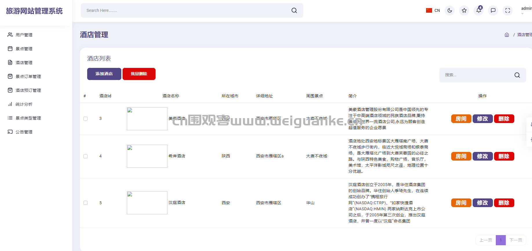 – 功能描述:管理员可以管理酒店信息,包括添加、删除、修改酒店。