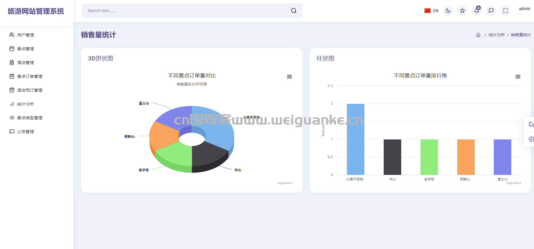 – 功能描述:管理员可以查看系统的统计数据,包括订单统计、用户统计等。