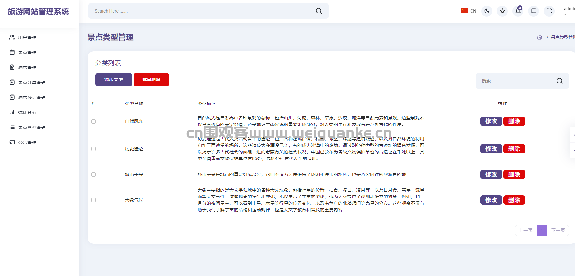 – 功能描述:管理员可以管理景点类型,包括添加、删除、修改景点类型。