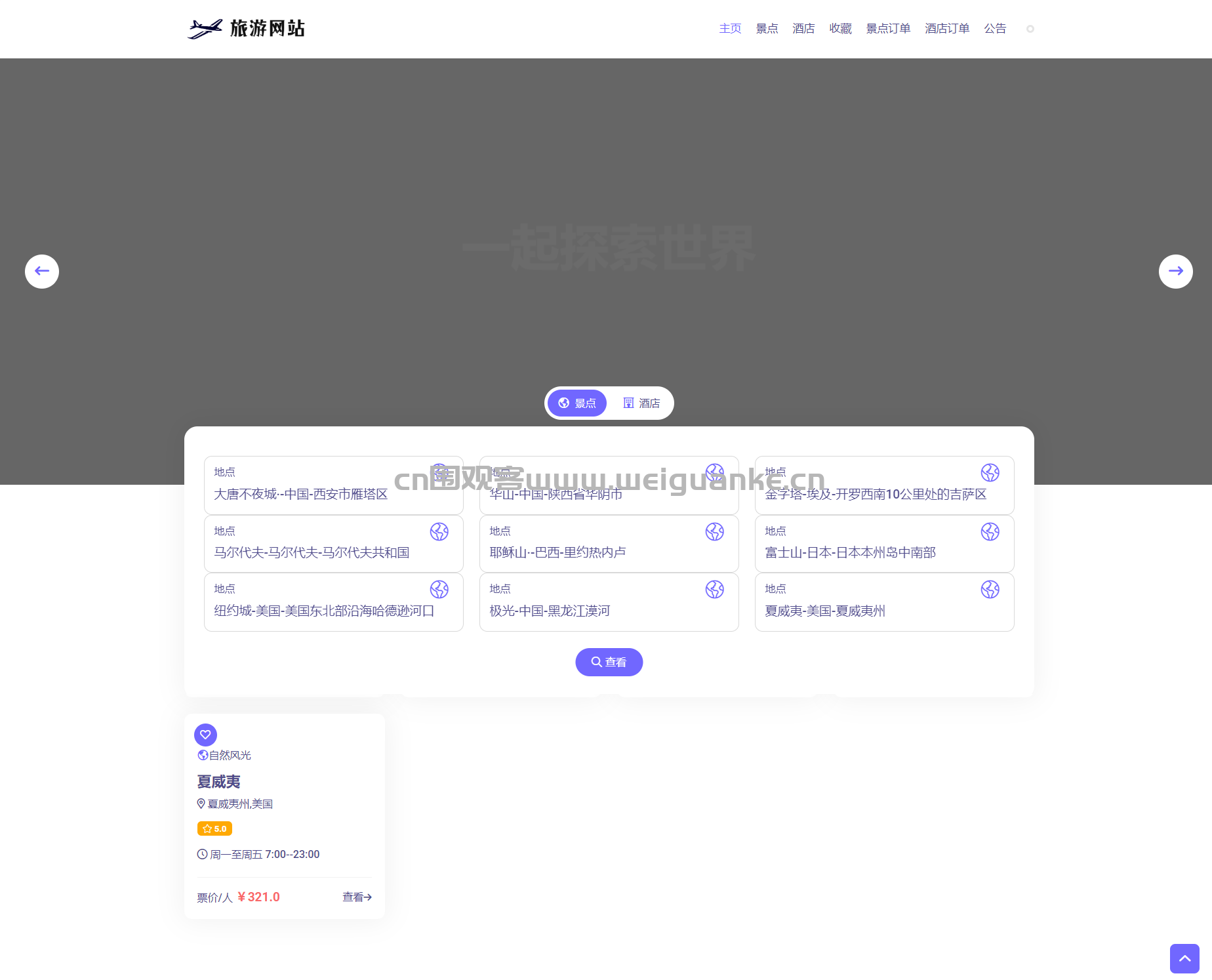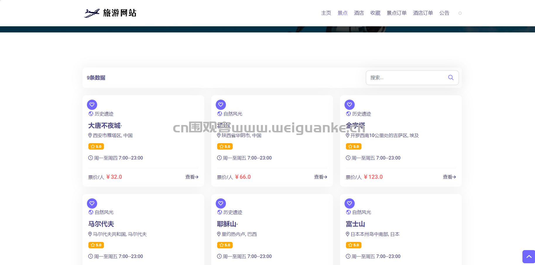 – 功能描述:用户可以浏览和搜索景点信息,查看景点详情,并进行预订。
