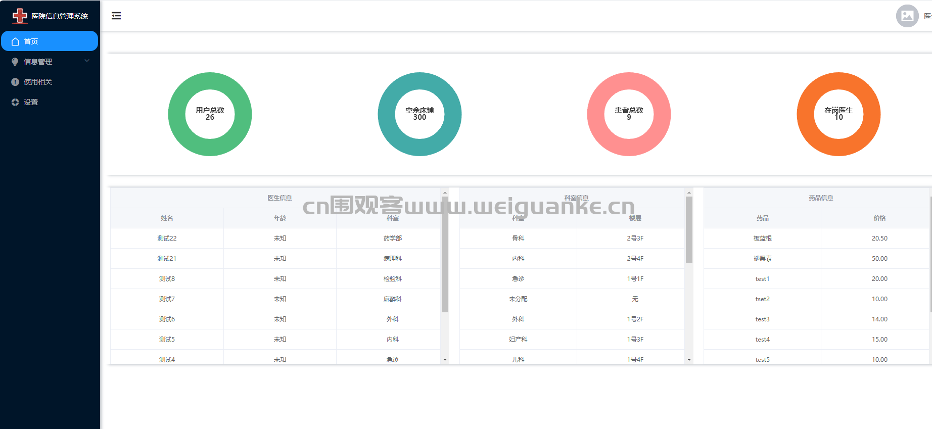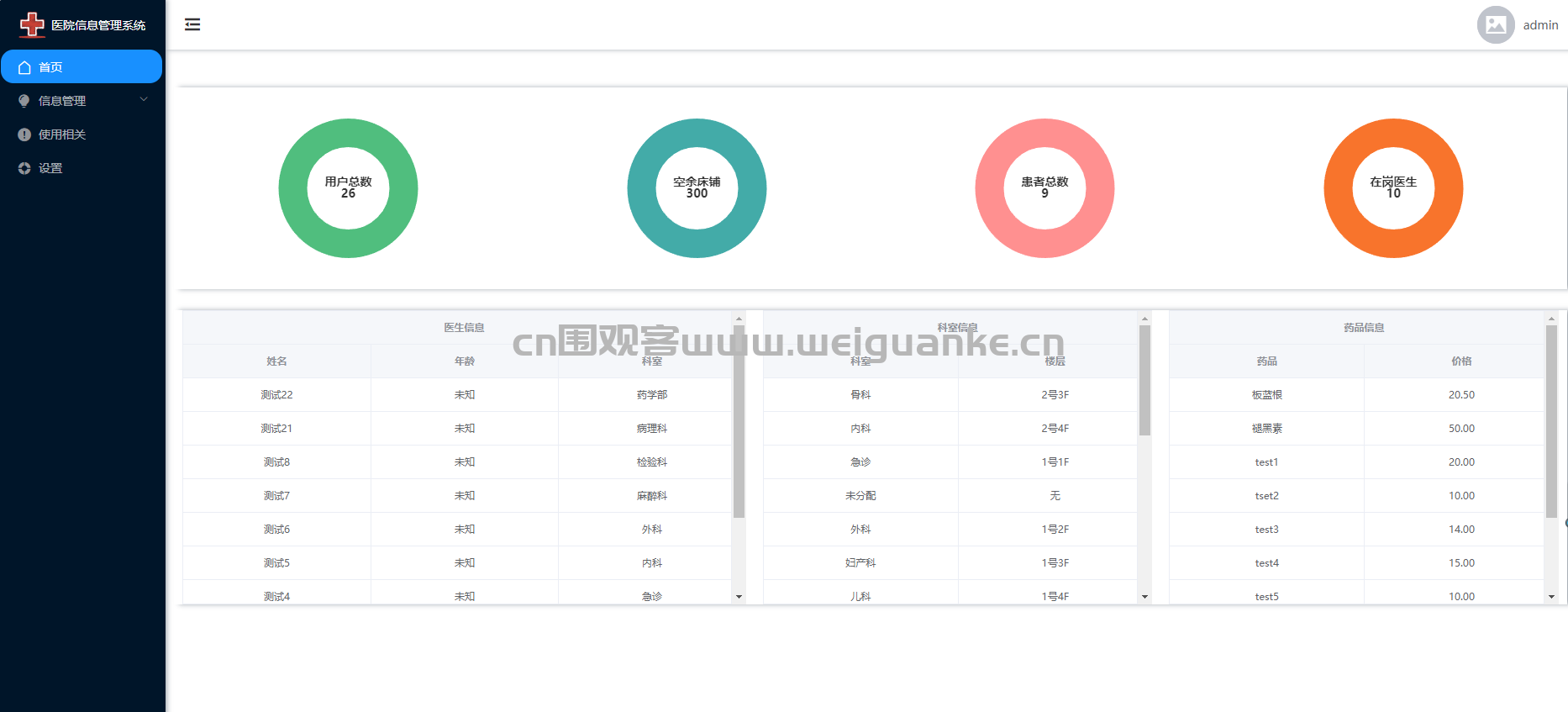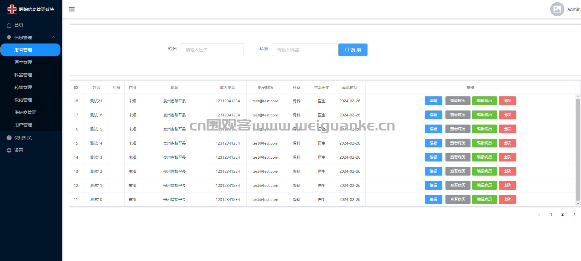 – 患者管理:管理员可以添加、编辑、删除和查询患者信息,包括患者的基本信息、病历记录、挂号记录等。支持批量导入患者信息,并提供搜索和筛选功能。