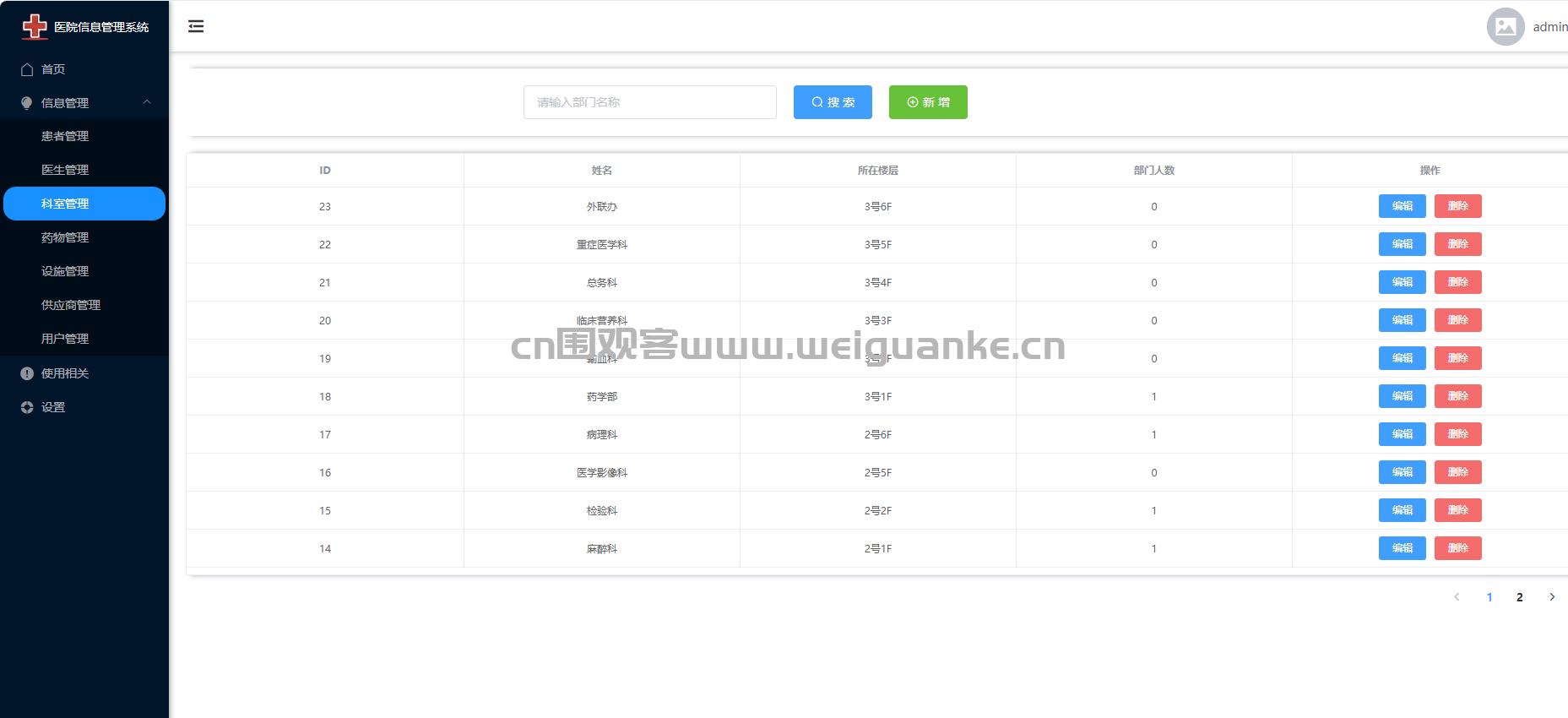 – 科室管理:管理员可以管理医院的科室信息,包括科室名称、科室负责人、科室设备等。支持对科室信息的新增、修改、删除操作。