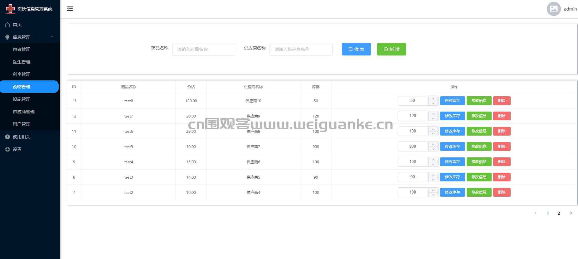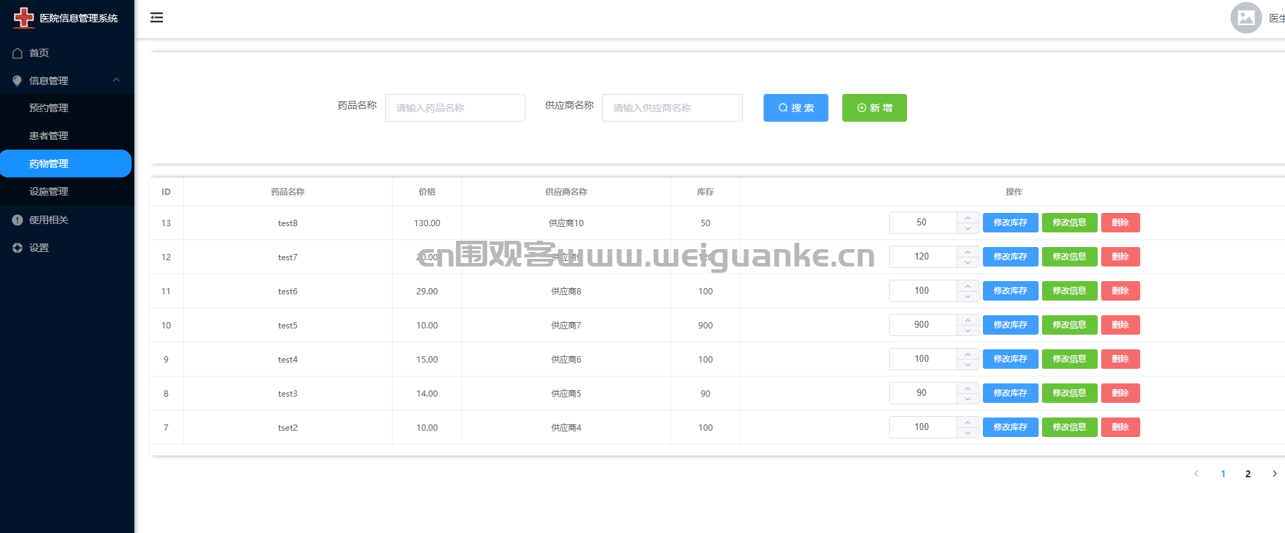 – 药物管理:管理员可以维护药物信息,包括药物名称、规格、生产厂家、库存数量等。支持对药物信息的新增、修改、删除操作,并提供库存预警功能。