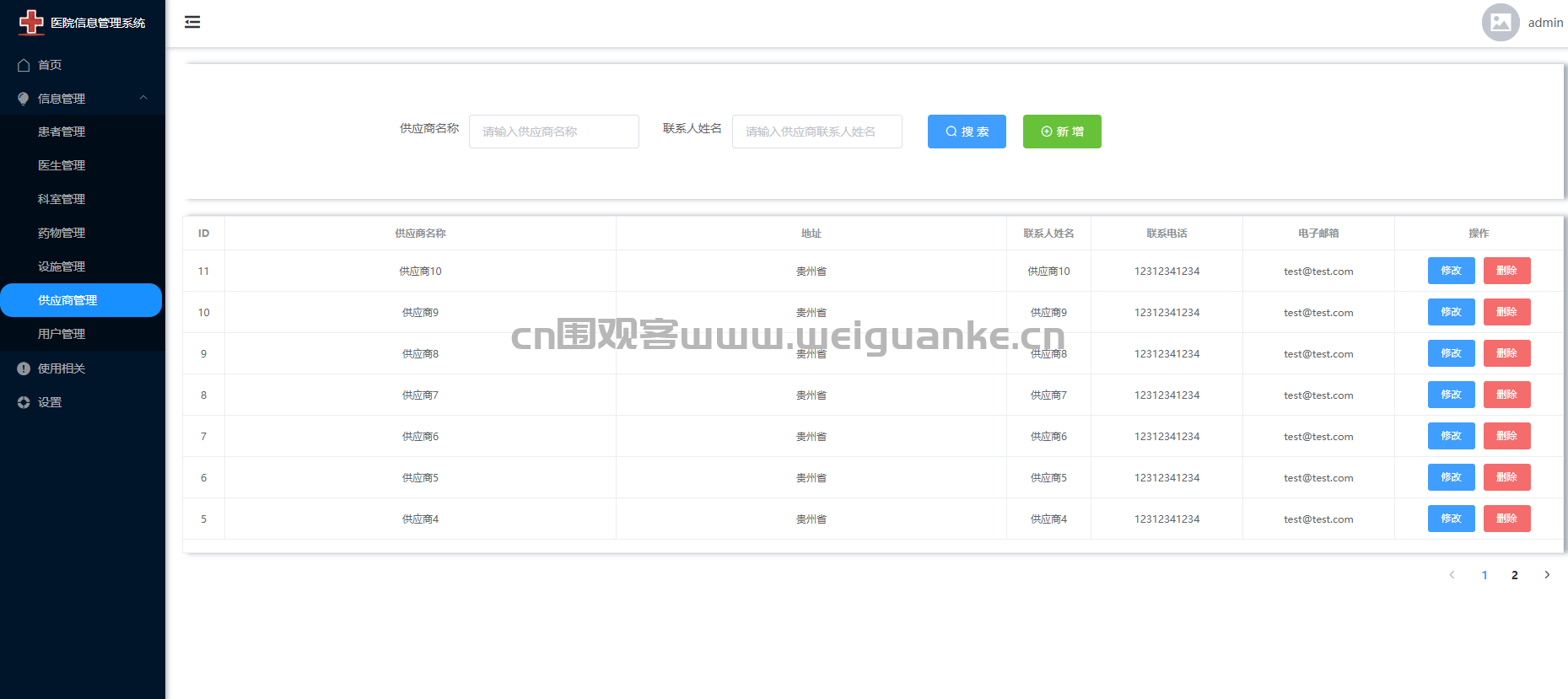 – 供应商管理:管理员可以管理供应商信息,包括供应商名称、联系方式、供应物品等。支持对供应商信息的新增、修改、删除操作。