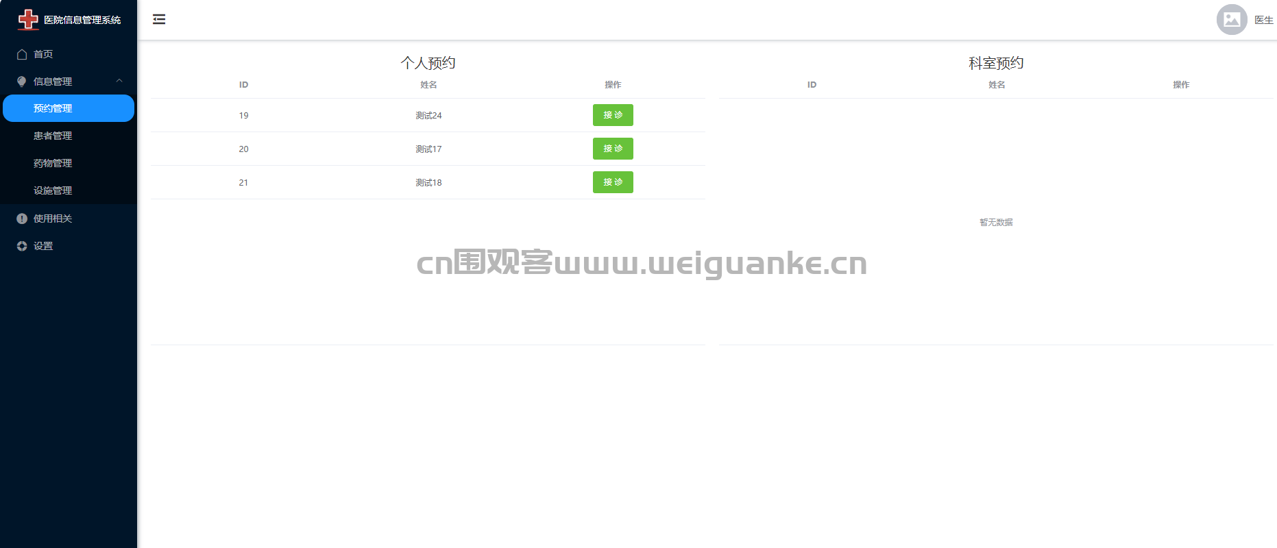 – 预约管理:医生可以查看和管理自己的预约信息,包括预约患者的基本信息、预约时间、预约状态等。支持对预约进行确认、取消或调整操作。
