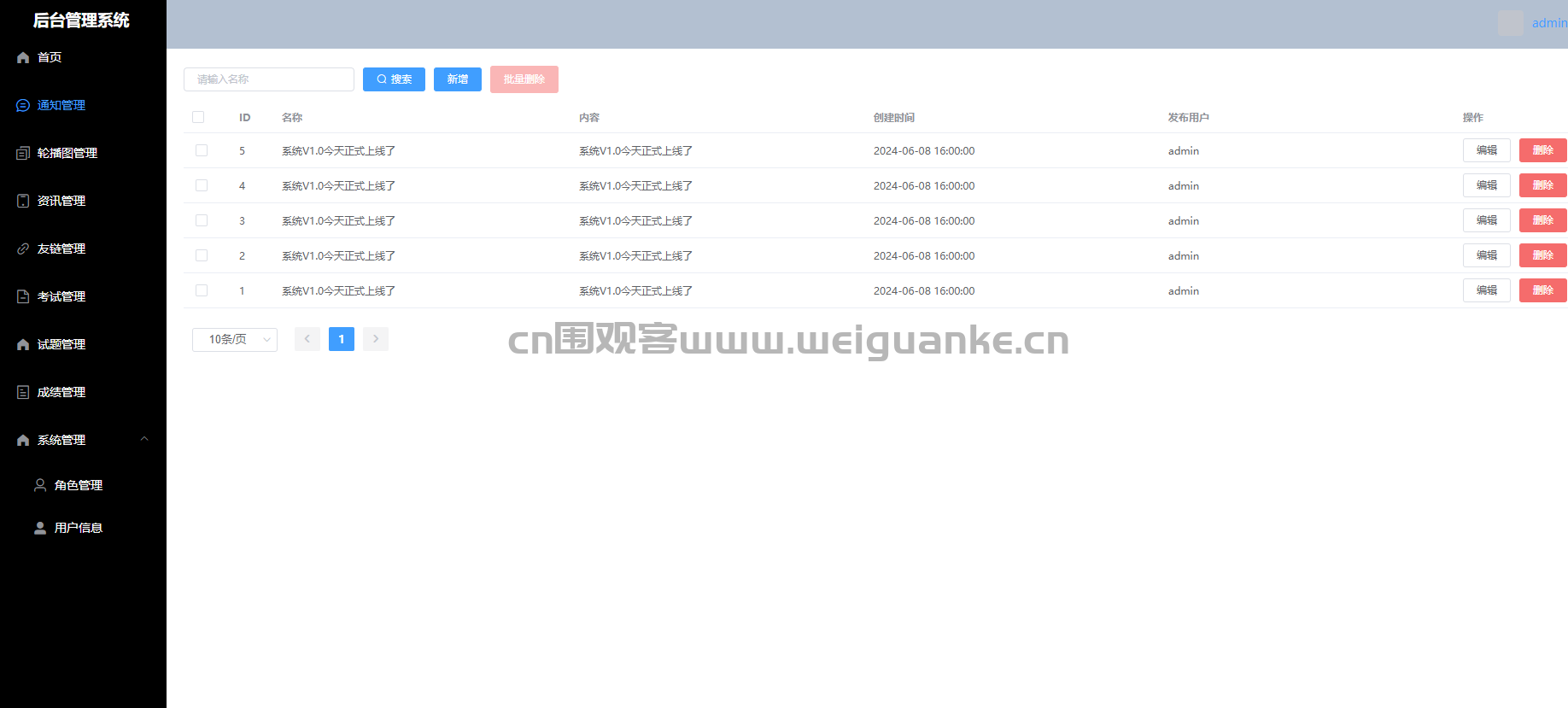 – 通知管理:发布、编辑、删除站内通知,确保信息及时传达。
