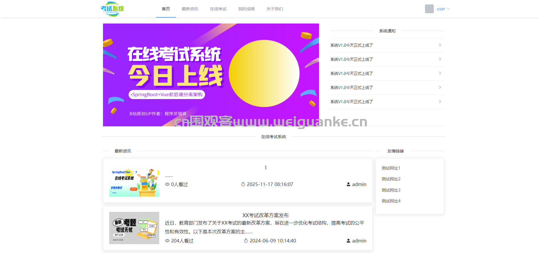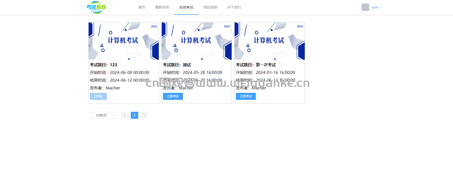 – 在线考试:参加系统安排的在线考试,提交答案。