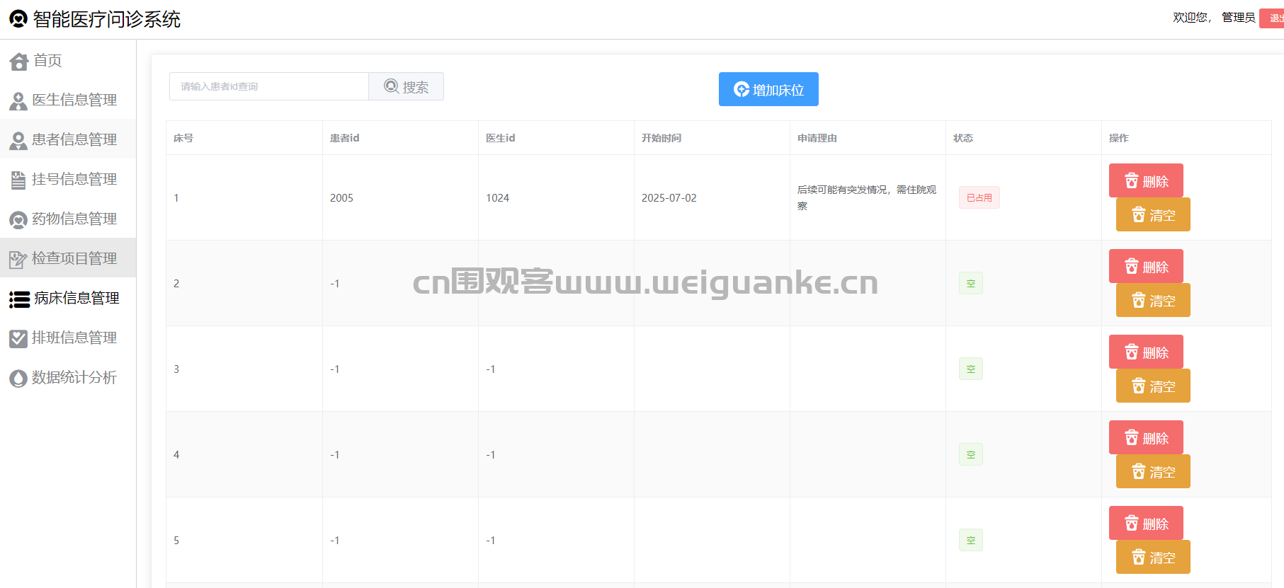 管理员负责管理病床信息,包括病床编号、所在科室、当前状态(空闲、占用、维修等)。支持对病床信息的新增、修改、删除操作,并提供病床分配功能,方便管理员根据患者住院需求合理分配病床。