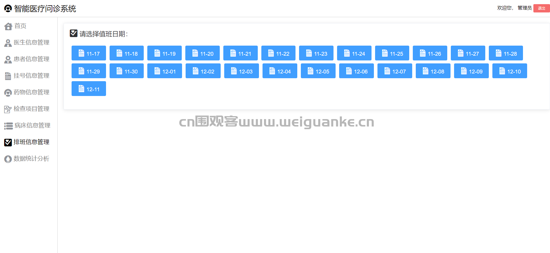 管理员负责制定和管理医生的排班信息,包括排班日期、排班科室、排班医生、工作时间等。支持批量导入排班信息,并提供排班信息的查询、修改、删除功能。可以生成排班表,方便查看医生的排班安排。
