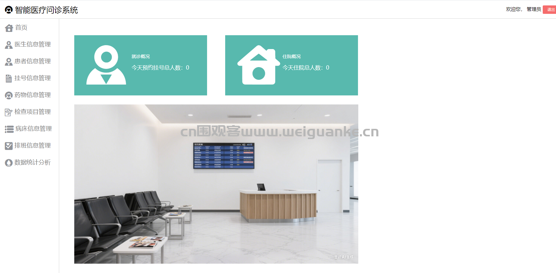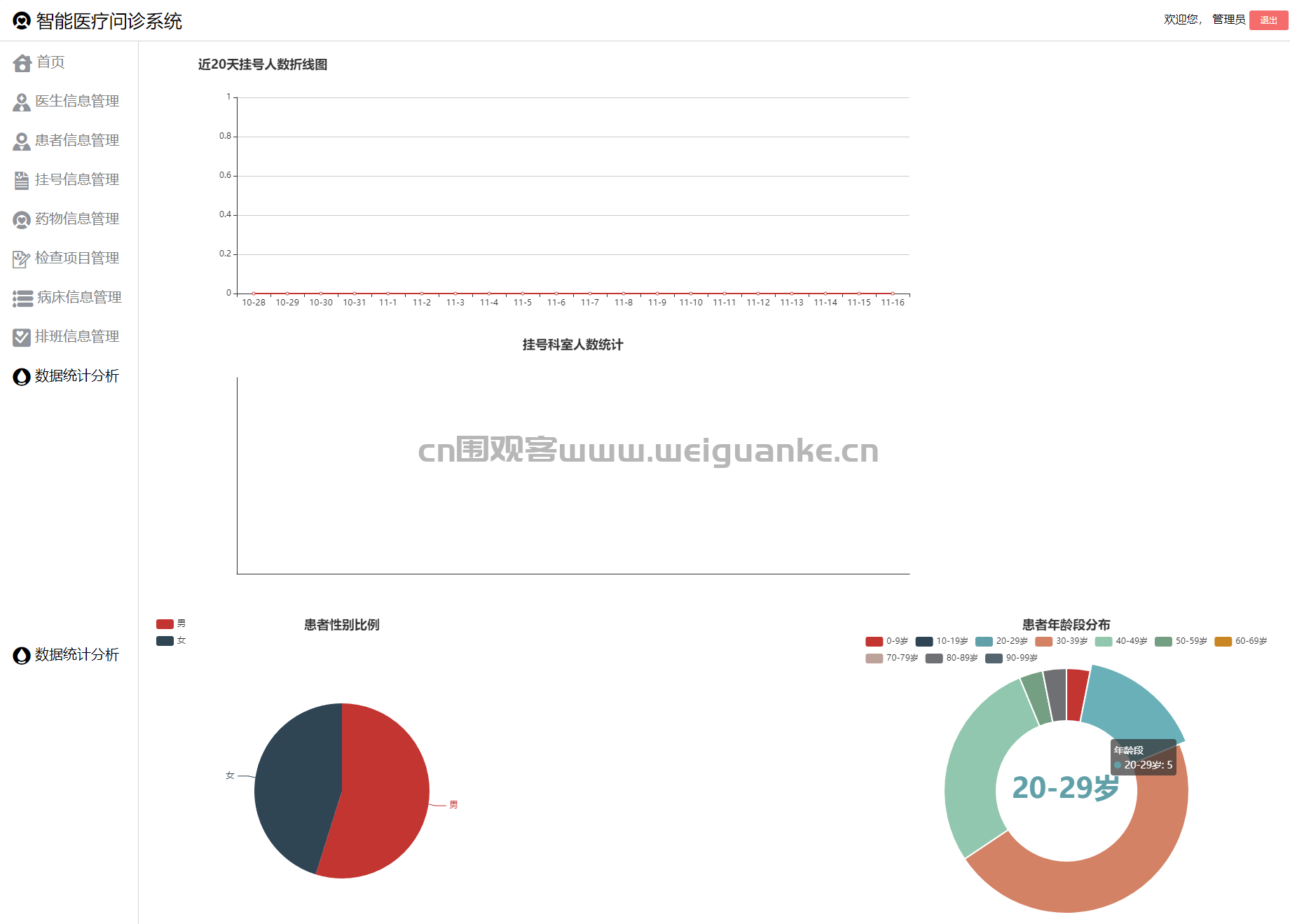 管理员可以通过该模块对医院的各项数据进行统计分析,包括挂号数量统计、医生工作量统计、药物使用统计、检查项目统计等。支持生成各种统计报表,并以图表形式展示数据,帮助管理员更好地了解医院的运营情况。