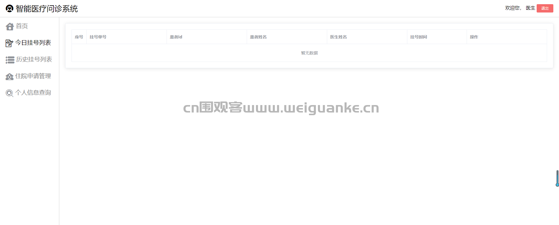 医生登录系统后,进入首页。首页展示医生的基本信息、今日工作安排(包括今日挂号数量、待处理住院申请等)以及系统通知。医生可以通过首页快速导航到其他功能模块。