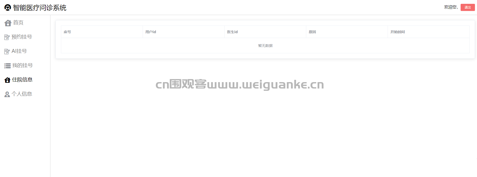 患者登录系统后,进入首页。首页展示患者的基本信息、我的挂号记录、住院信息等重要信息。患者可以通过首页快速导航到其他功能模块。