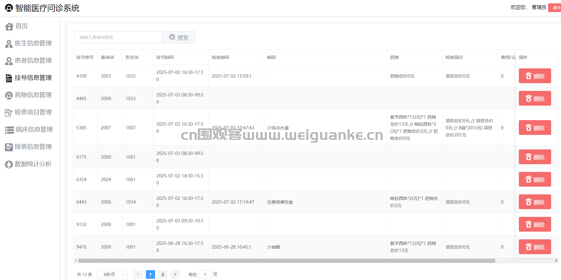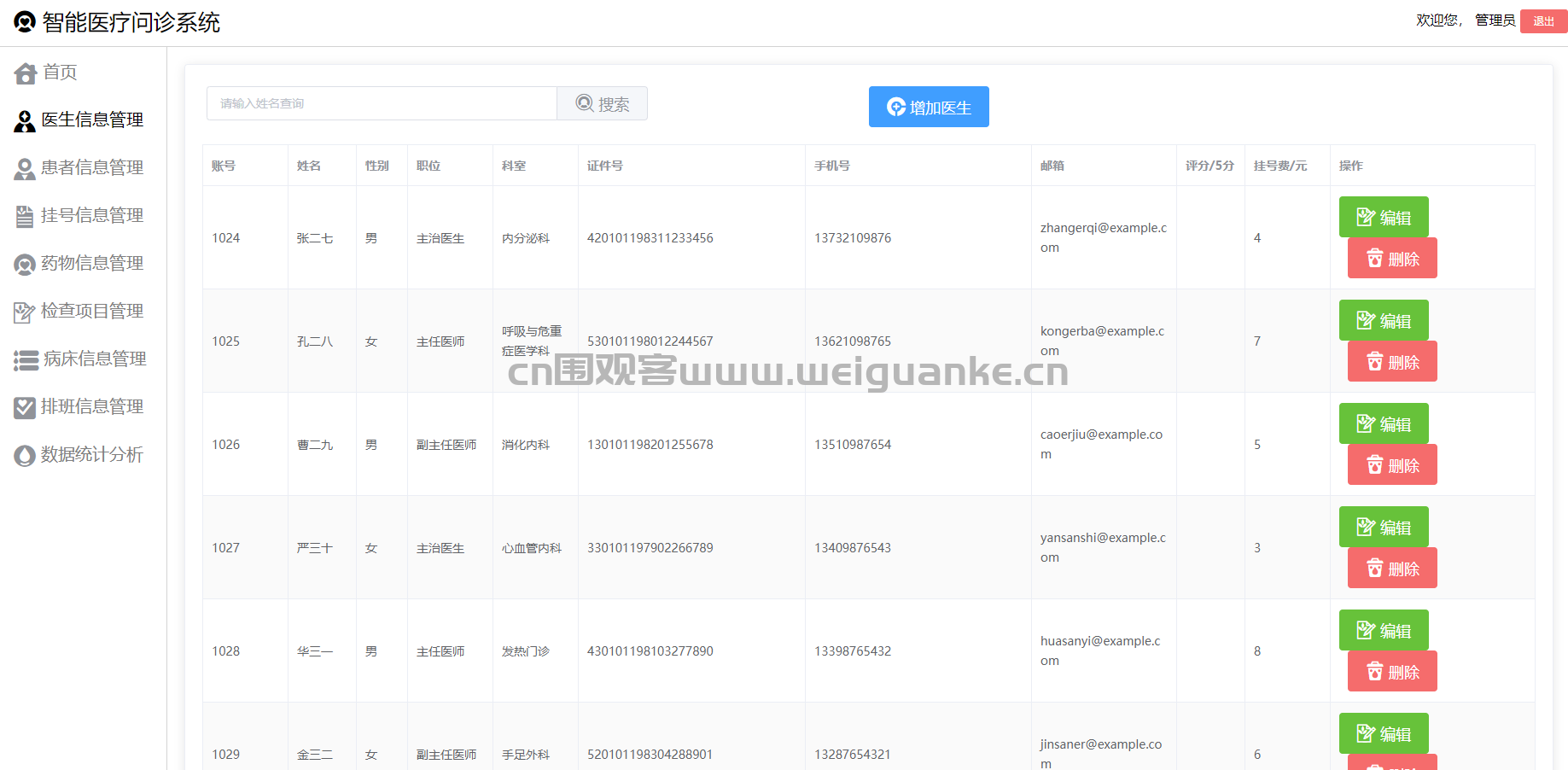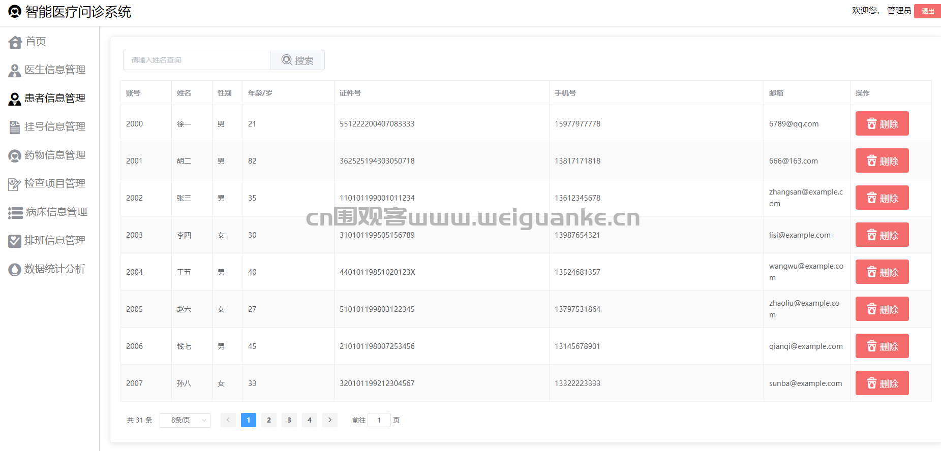 管理员负责管理患者的基本信息,包括姓名、性别、年龄、身份证号、联系方式等。支持对患者信息的新增、修改、删除和查询操作。同时,可以查看患者的挂号记录、住院记录等历史信息。