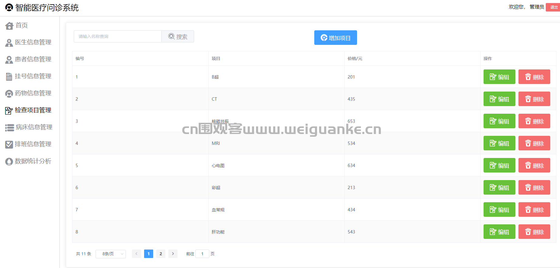 管理员可以管理医院的检查项目,包括检查名称、检查类型(如血液检查、影像检查等)、检查费用、检查科室等信息。支持对检查项目的新增、修改、删除操作,并提供检查项目的查询功能。