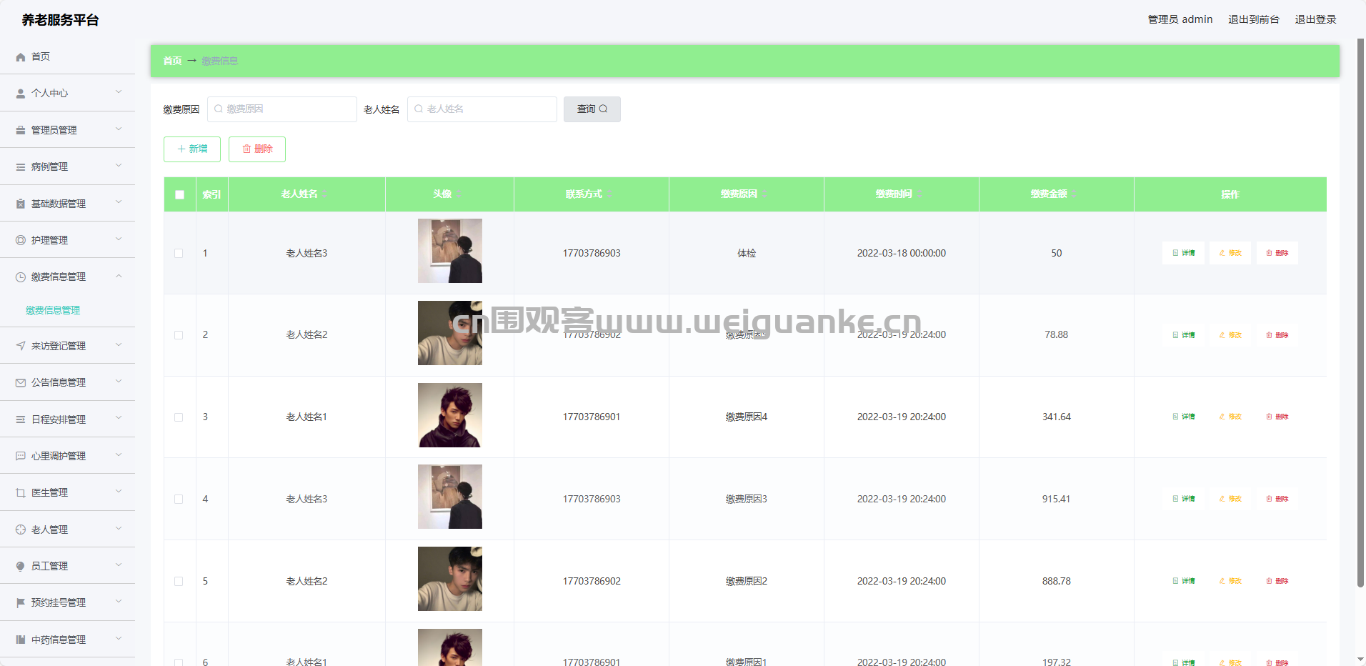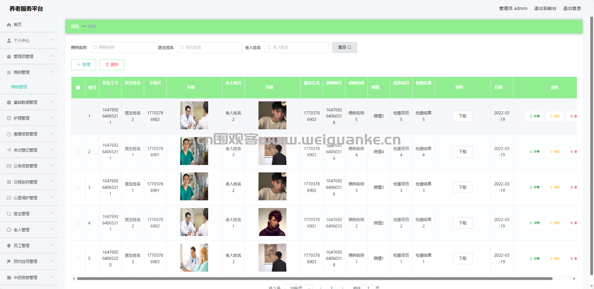 老人管理:入住档案、健康画像、风险预警,360°关爱每位长者。