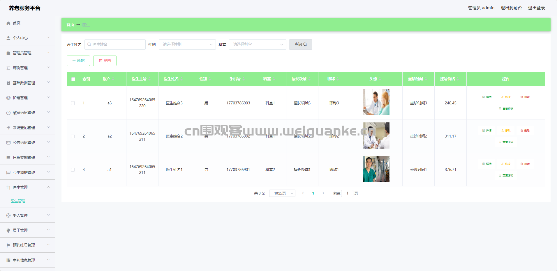 医生管理:医师资质、排班、绩效与患者评价一体化档案。