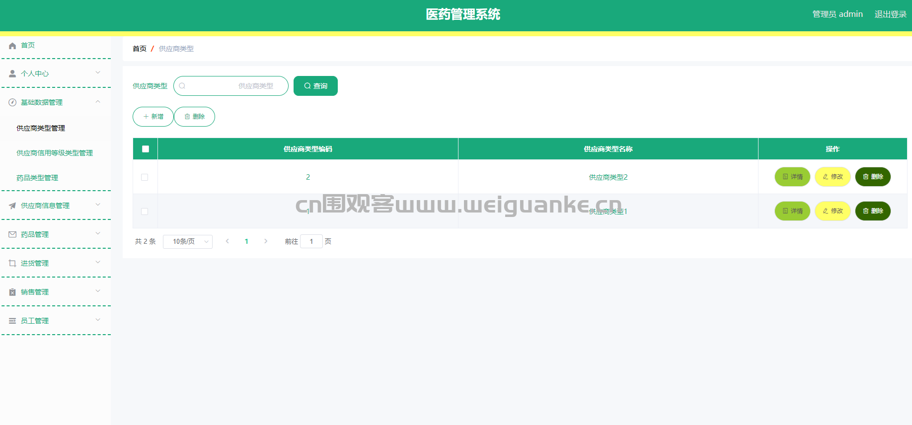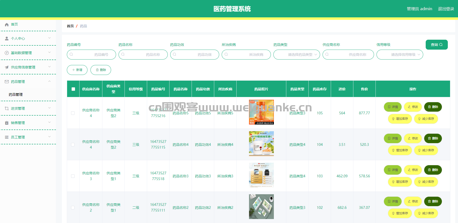 功能描述:管理药品的详细信息,包括药品名称、规格、生产厂家、有效期、库存数量等,支持新增、修改、删除和查询药品信息。