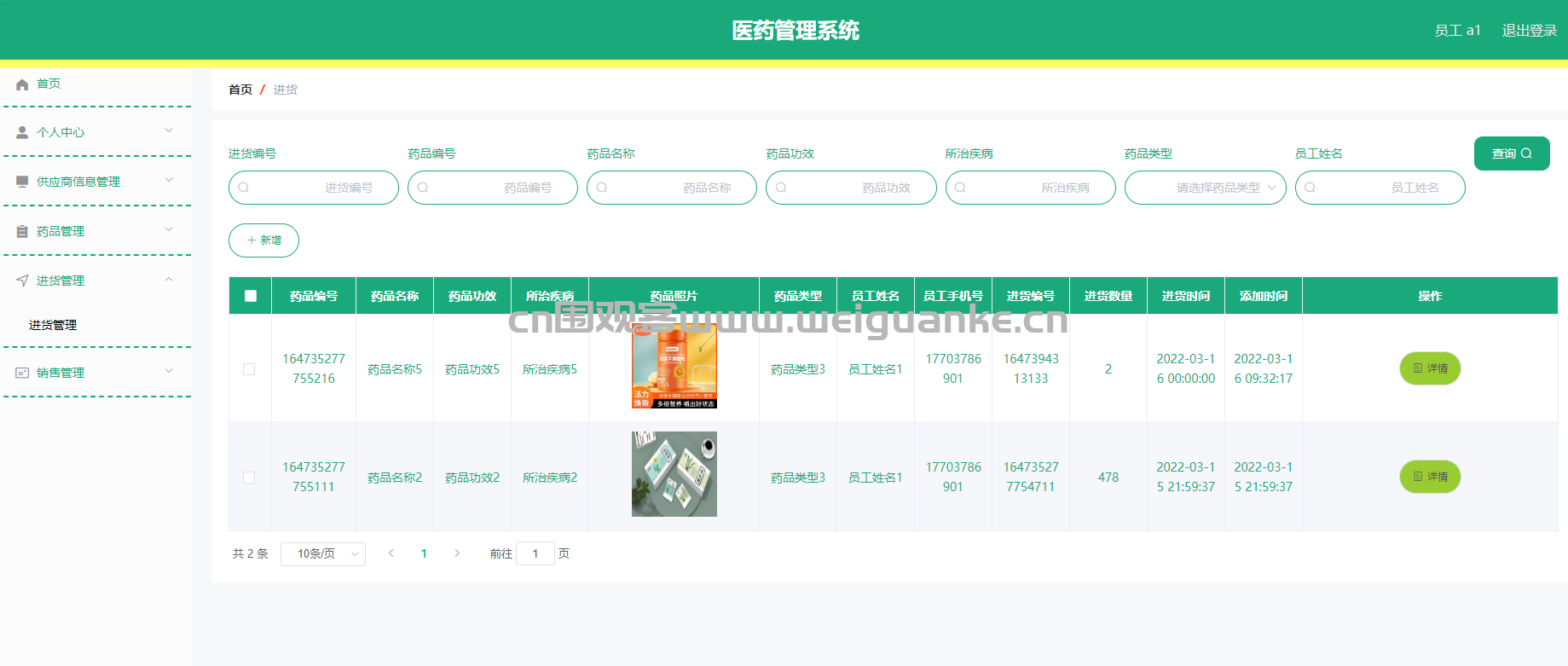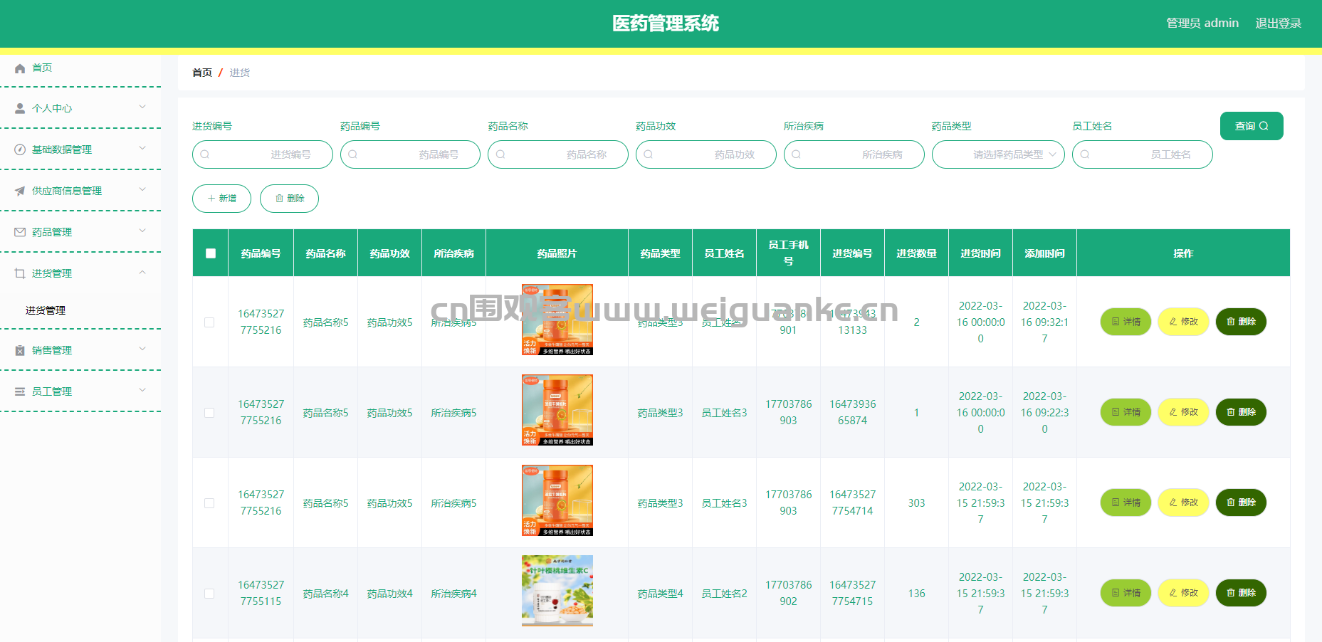 功能描述:处理药品进货流程,包括记录进货信息、更新库存等,支持对进货单的查询。