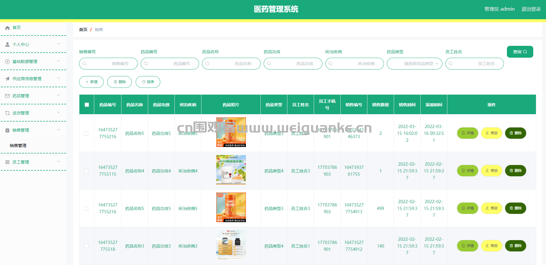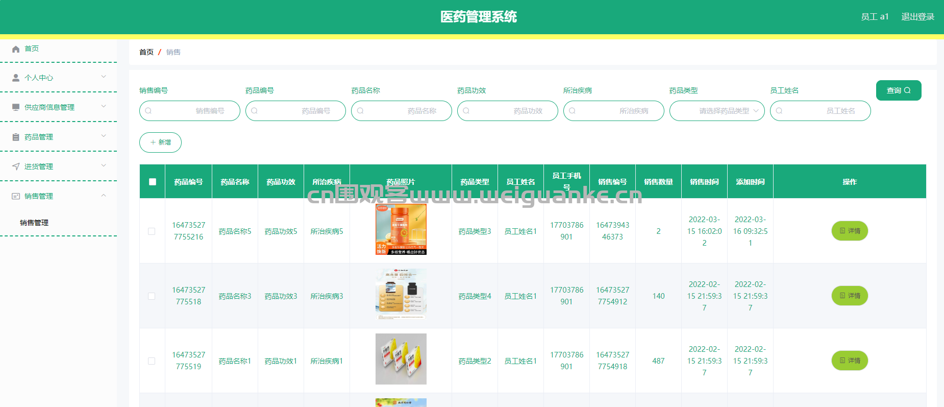功能描述:管理药品销售流程,包括记录销售信息、更新库存等,支持对销售单的查询。