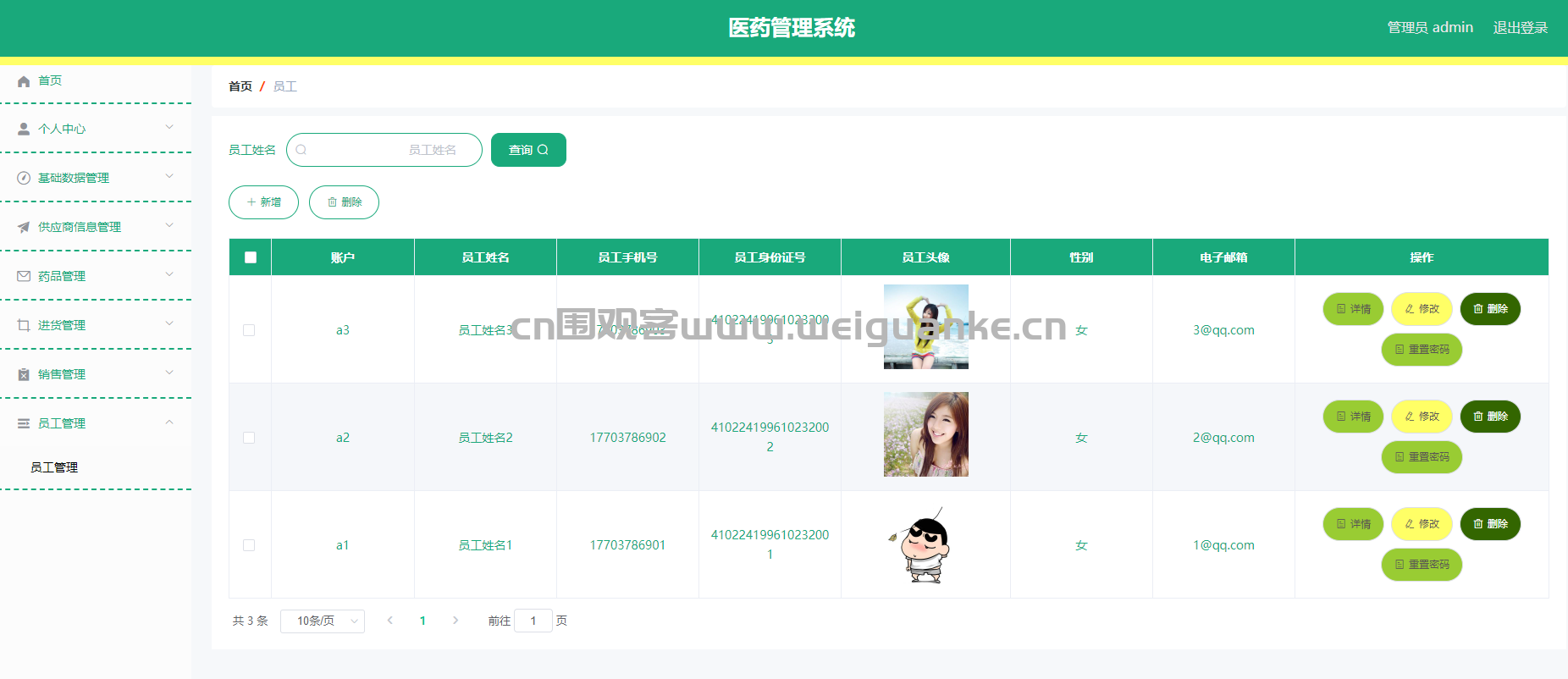 功能描述:管理公司员工信息,包括员工的基本信息、岗位、权限等,支持新增、修改、删除和查询员工信息。