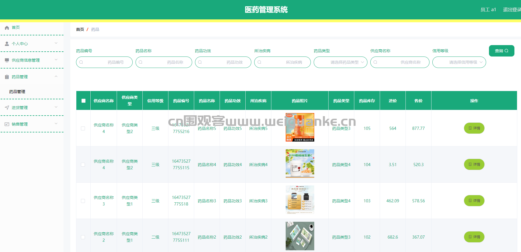功能描述:管理药品的详细信息,包括药品名称、规格、生产厂家、有效期、库存数量等,支持查询和查看药品信息。